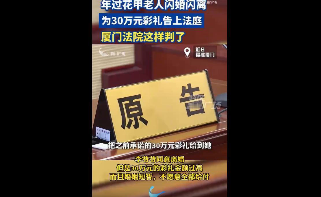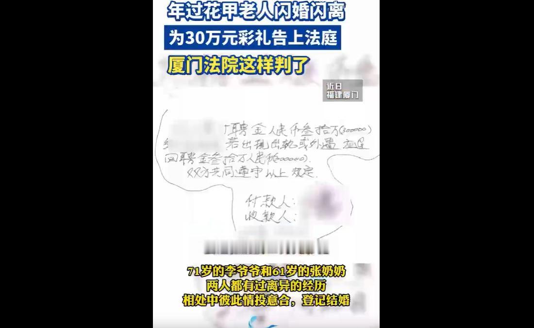 71岁李爷爷和61岁张奶奶,都是离异人士,本该珍惜晚年相伴的缘分,相处中情投意合后登记结婚,李爷爷还大方承诺给张奶奶30万彩礼,交付方式也挺“讲究”——把钱共同出借给案外人,两人一起当债权人,本以为是诚意满满,结果婚后才半年,就因为性格、生活习惯不合,吵得不可开交,张奶奶直接起诉离婚,还一口咬定30万彩礼得全归自己。 张奶奶61岁的年纪,不好好安享晚年,反倒玩起了“闪婚闪离要彩礼”的戏码,合着这黄昏恋,不是奔着相伴到老去的,是奔着30万彩礼来的? 李爷爷也不傻,同意离婚,但坚决不乐意把30万全给,毕竟婚姻就维持了半年,连个共同子女都没有,自己还承担了大部分生活支出,换谁都得觉得亏! 更有意思的是法院的判决,简直是清醒到解气! 法官助理说了,这彩礼金额确实太高,再加上两人结婚半年就离婚,共同生活时间短,没孩子,男方还掏了不少生活费,结合厦门本地习俗和人均可支配收入,酌情把彩礼降到10万,最终判决10万债权归张奶奶所有。 这波操作,既没让李爷爷白白吃亏,也没让张奶奶彻底落空,狠狠打了那些想靠闪婚敛财的人的脸。 网友看完直接炸锅:“黄昏恋变彩礼大战,太掉价了”“30万彩礼,这老太是想靠结婚发笔财吧”“法院判得太对了,凭啥闪婚半年就能拿30万”。 其实这事说白了,就是两位老人太功利,把婚姻当成了交易,张奶奶想靠结婚捞一笔彩礼,李爷爷以为30万就能买个晚年陪伴,结果竹篮打水一场空,最后闹到对簿公堂,颜面尽失。 更讽刺的是,本该是温馨的黄昏恋,硬生生被彩礼搅成了闹剧。 很多老人离异后,都想找个伴安度晚年,可这两位倒好,眼里只有钱,忽略了婚姻的本质是相伴相守,不是互相算计。