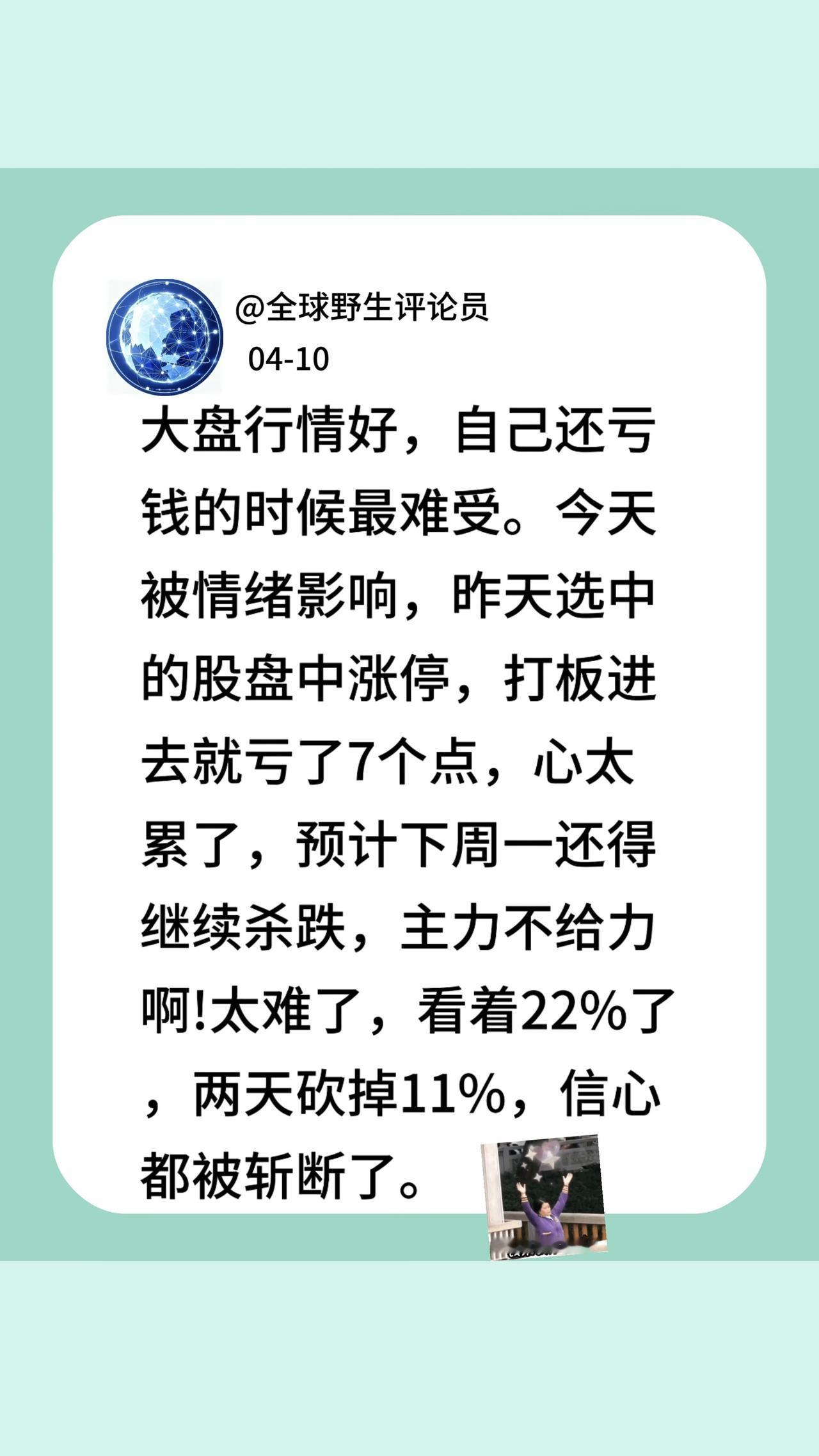 收盘看了一下大曾老师,还有更惨的,一下子平衡了不少。所以大曾老师,就是给散户信心的存在。散户