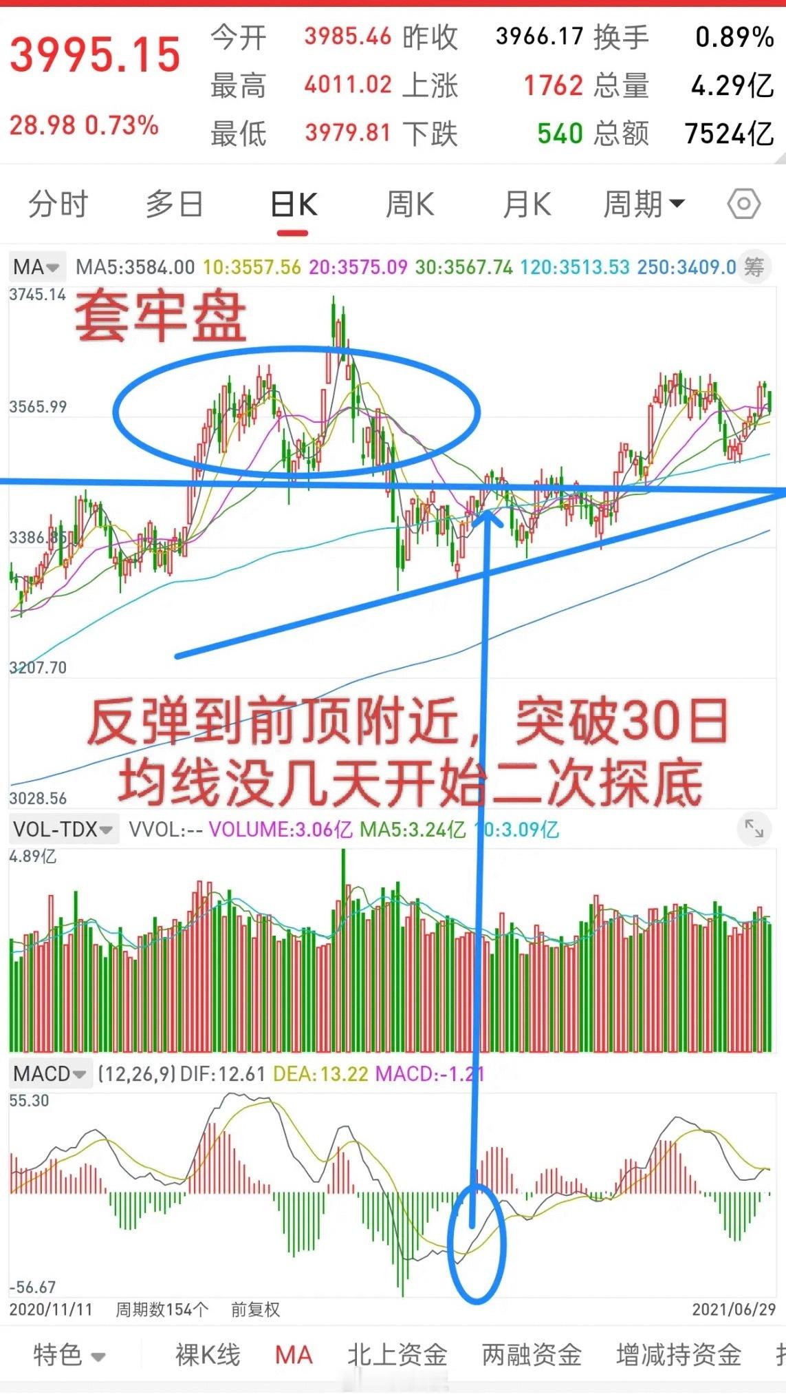 大家看,下面第一张图,是2021年的走势,当时从3731-3328一路下跌,初中期反弹时,4.1号的时候被30日均线压制,4.2号的时候直接突破,4.6号见高点3493,然后从4.6号一路下跌至4.15号最低点3373,而当时十月均线3385左右(再一次破了十月均线,技术派就会多转空)。