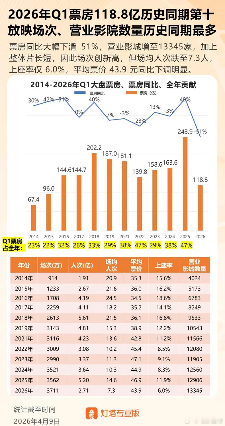 听听温特怎么说 灯塔数据 第一季度票房2016年以来最差。2015年不含服务费最终票房437亿影院数量5173家。 2026年目前有数据的影城1.33万家。