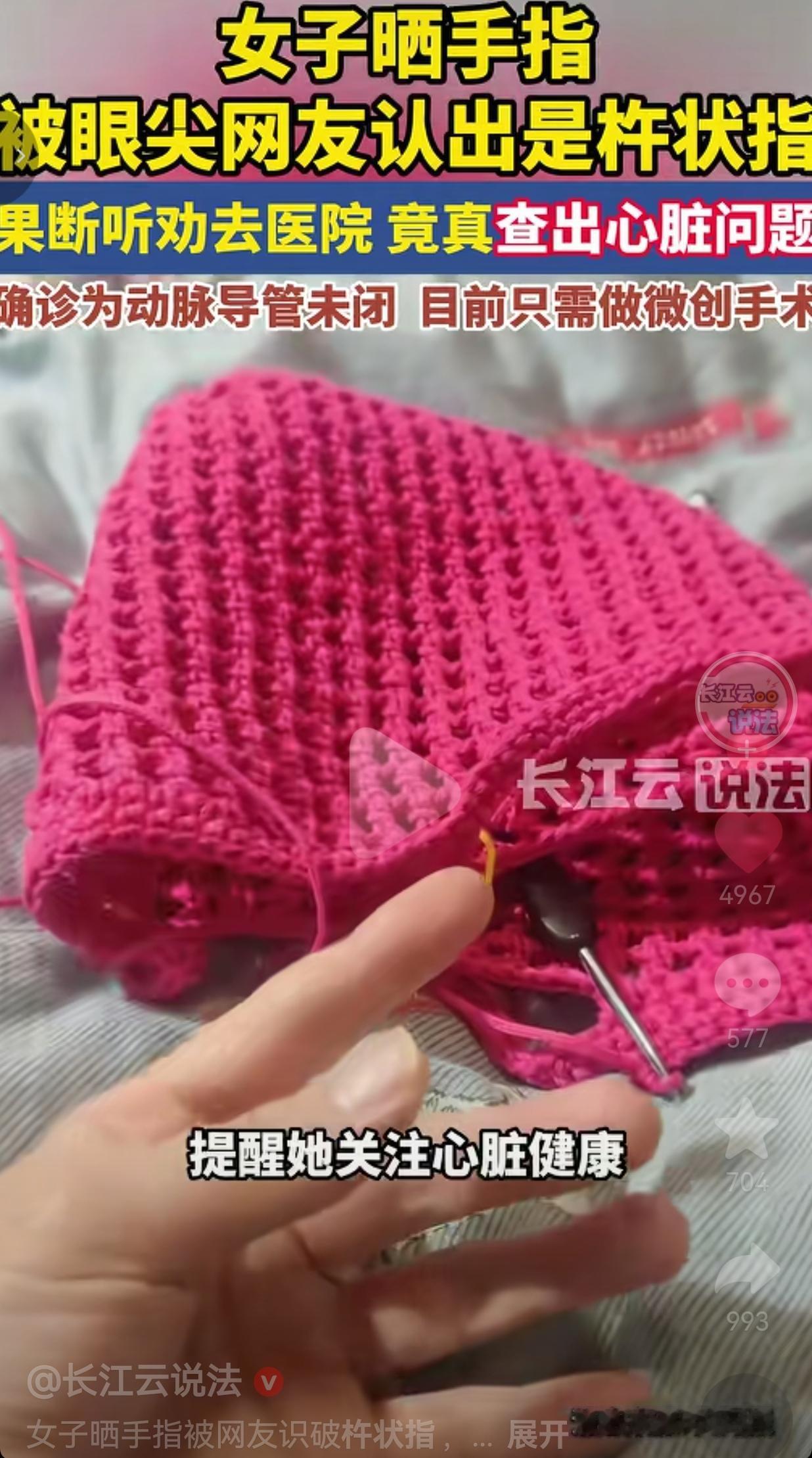 多亏了网友!湖南长沙一女子晒自己的钩织作品,就因为手指入镜,被眼尖网友一眼认出是“杵状指”,劝她赶紧去查心脏! 结果一查,真查出了动脉导管未闭!网友:这哪里是网友,这就是救命恩人啊! 近日,湖南长沙一位喜欢钩织的小姐姐,像往常一样在网上分享自己的作品,晒出了自己做的小花、胡萝卜,还有钩织时的手部特写。 她自己完全没当回事,可视频一发出,评论区直接炸了! 无数网友一眼就看出不对劲:“姐妹,你这手指是杵状指啊!赶紧去查心脏!”“别不当回事,杵状指大概率是心脏问题,快去医院!” 小姐姐一开始也懵了,自己从来没觉得不舒服,怎么就和心脏扯上关系了?但架不住网友们反复提醒,还是赶紧去了长沙县妇幼保健院检查。 结果不查不知道,一查吓一跳!医生确诊她患有动脉导管未闭,这是一种先天性心脏病! 万幸的是,发现得早,只需要做一个微创手术就能治愈,完全不影响以后的生活! 拿到诊断书的小姐姐,对着镜头连连感谢:“你们太厉害了!你们太神了!真的是救了我一命!” 网友看到后评论说:我的天!这就是互联网的温度吧!素不相识,却拼尽全力提醒,真的太暖了! 也有的网友说:作为医生真的太感动了!杵状指是很多心肺疾病的信号,能被网友认出来救了人,太牛了! 还有的网友说:我以后晒手工都要仔细看自己的手指了!这波真的给所有人上了一课! 更有网友表示:这才是真正的“网友”!不是网暴,是救命!这才是互联网该有的样子! 多少人刷短视频就是图一乐,可这位小姐姐的一条日常分享,却被无数素不相识的网友放在了心上。 他们不是多管闲事,是用自己的知识,硬生生把一个人从危险边缘拉了回来! 很多人觉得杵状指离自己很远,可它就是身体给你发的求救信号:手指末端膨大、指甲隆起,大概率是心肺出了问题! 这位小姐姐要是没听劝,要是网友没提醒,后果不堪设想! 更难得的是,小姐姐没有杠、没有怼,而是虚心接受、及时就医,这才是最正确的操作! 我们总说互联网戾气重,可这一刻,我看到的全是善意、全是温暖、全是人间真情! 通过这事也给我们提了个醒:永远不要小看身体发出的每一个微小信号,永远不要辜负陌生人的每一份善意提醒! 互联网从来不是只有争吵和网暴,它也可以是救命的桥梁,是温暖的港湾! 也希望所有人都能多学一点健康知识,多一份警惕,多一份善意,说不定你的一句话,就能救别人一条命! 最后,我想说的是:善意照亮生命,知识守护健康,每一份提醒,都是一次重生的机会! 对此,你怎么看?