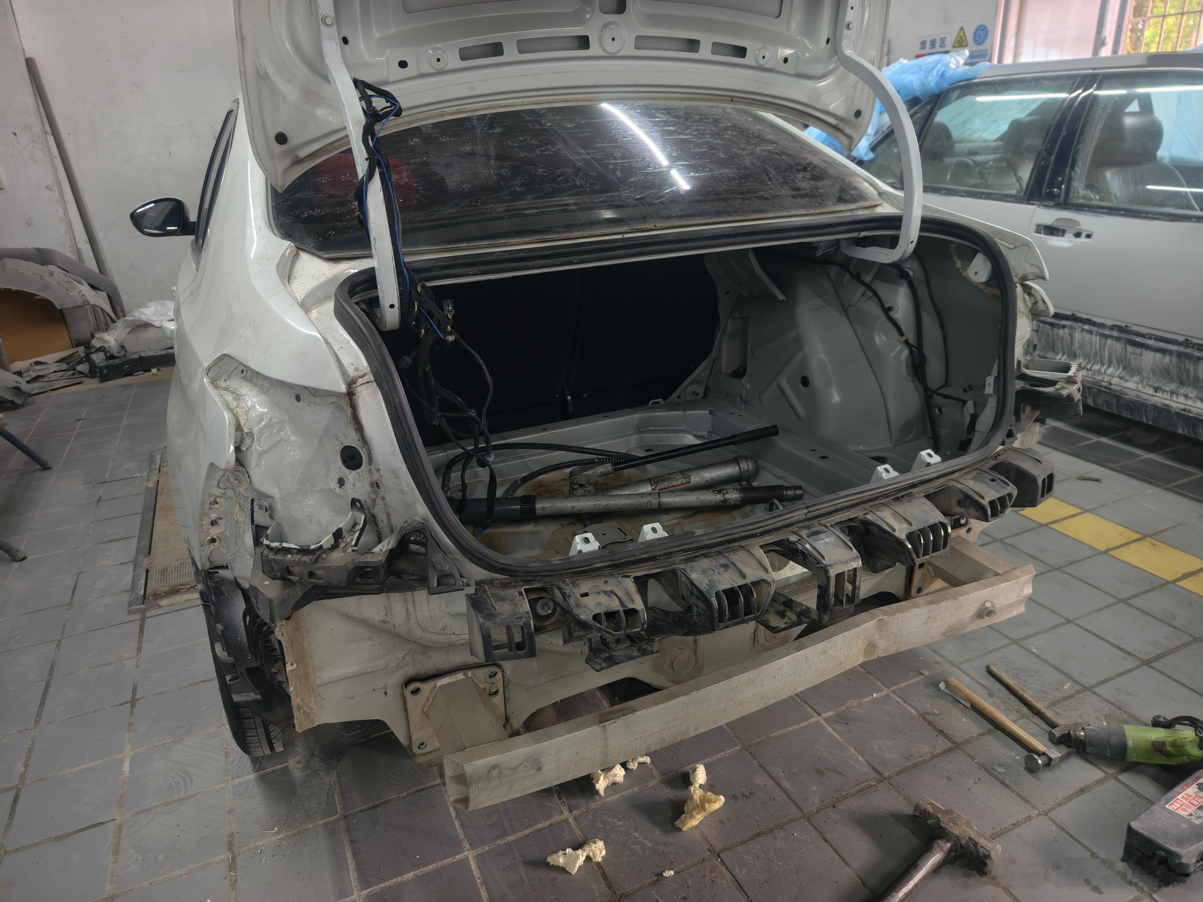 这台粉丝大哥的408在四五天就整好了左后是原本就有撞过,后叶切割并且修复比较粗糙而这次后盖后围板被撞的位置修复后完全看不出之前的严重程度,后盖直接更换原厂拆车件,漆膜仪测下去也仅仅只能测出喷漆,后围板修复下就只能看出一点点痕迹,整体修复后效果还是比较好的,而后防撞梁凹的位置可修可不修,安全上不会有太大区别,等这些都弄好后就开始整备其他地方了!