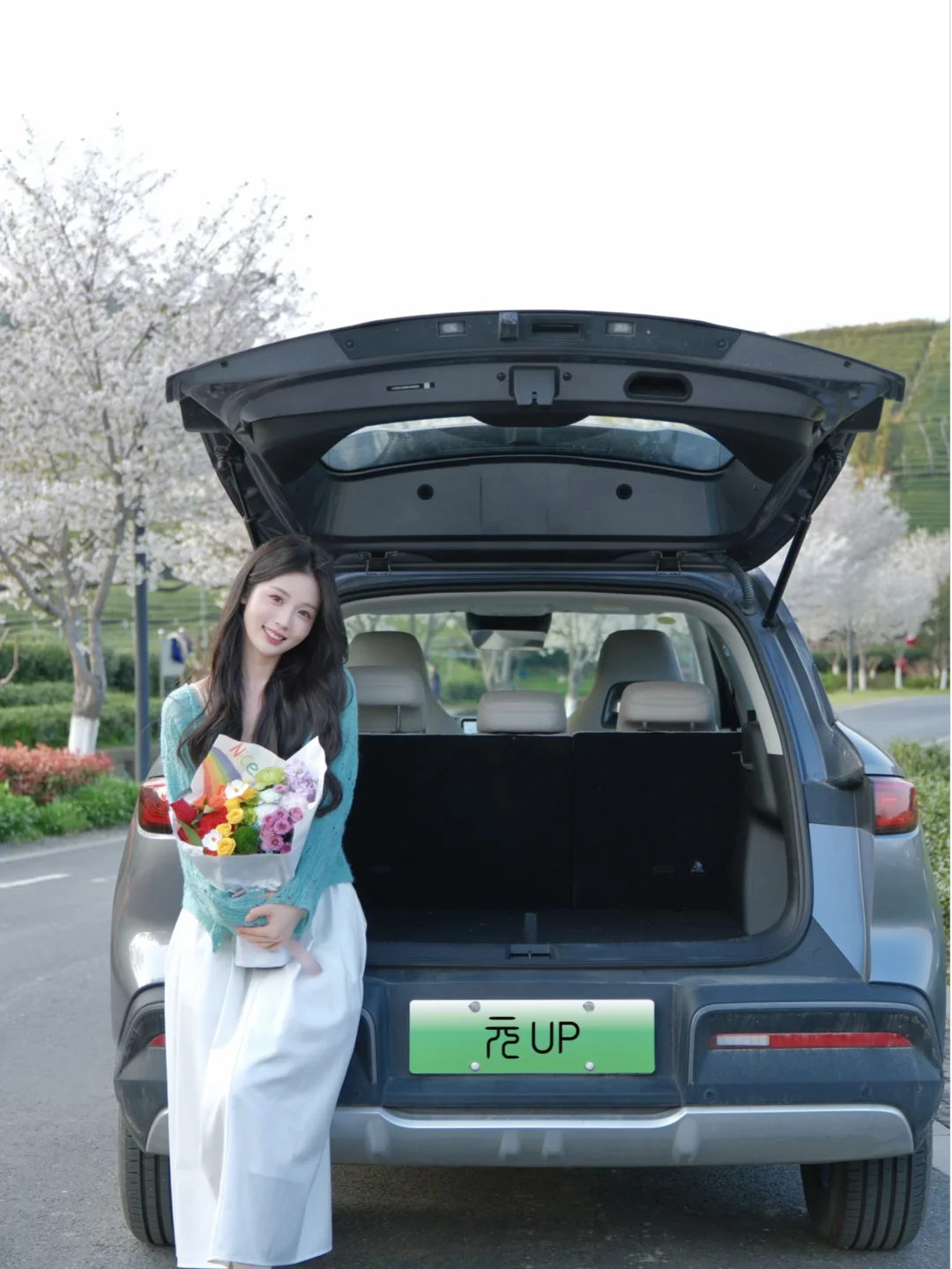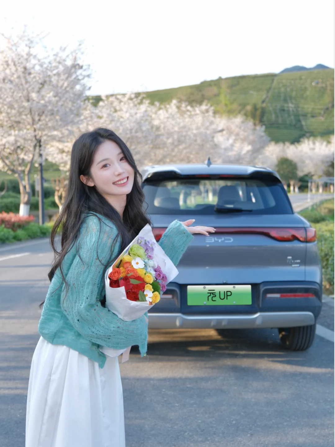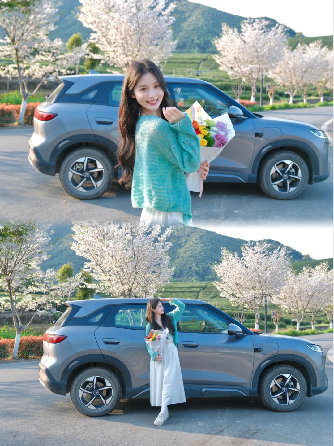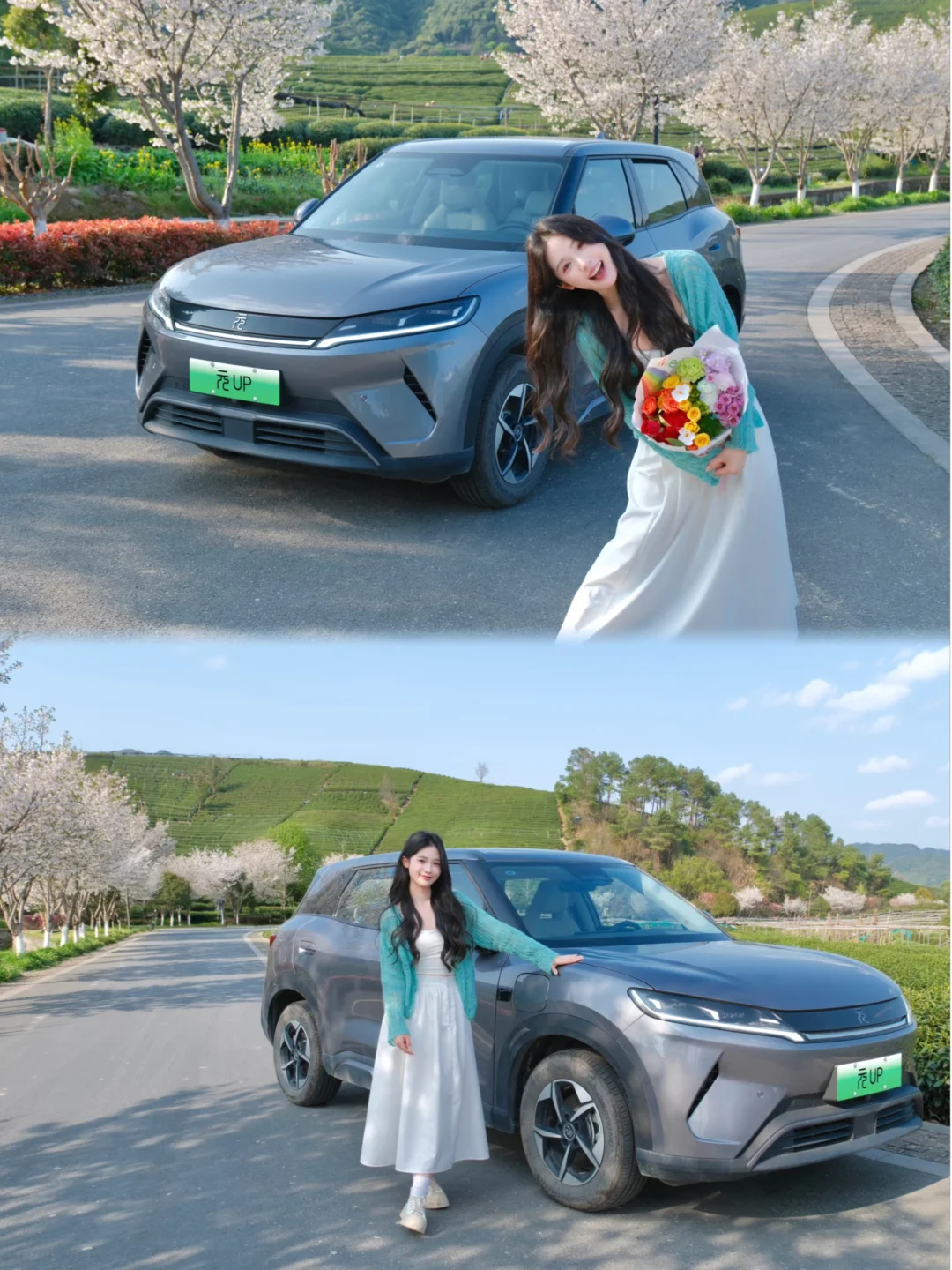 搭配远处的茶园和树上的樱花