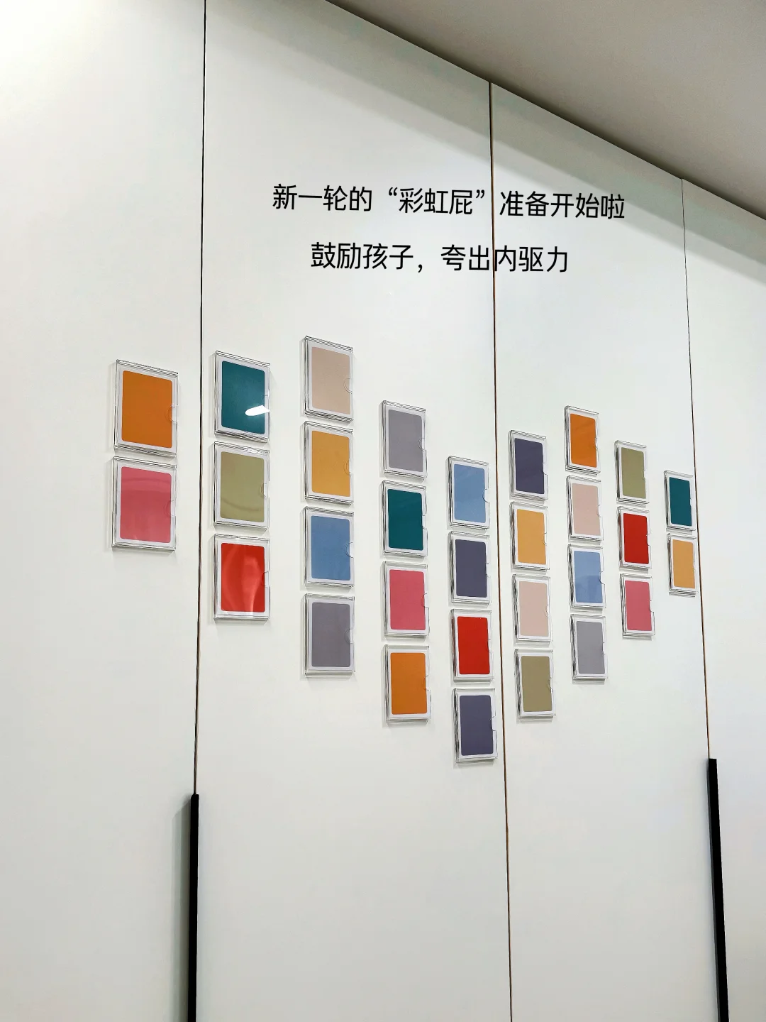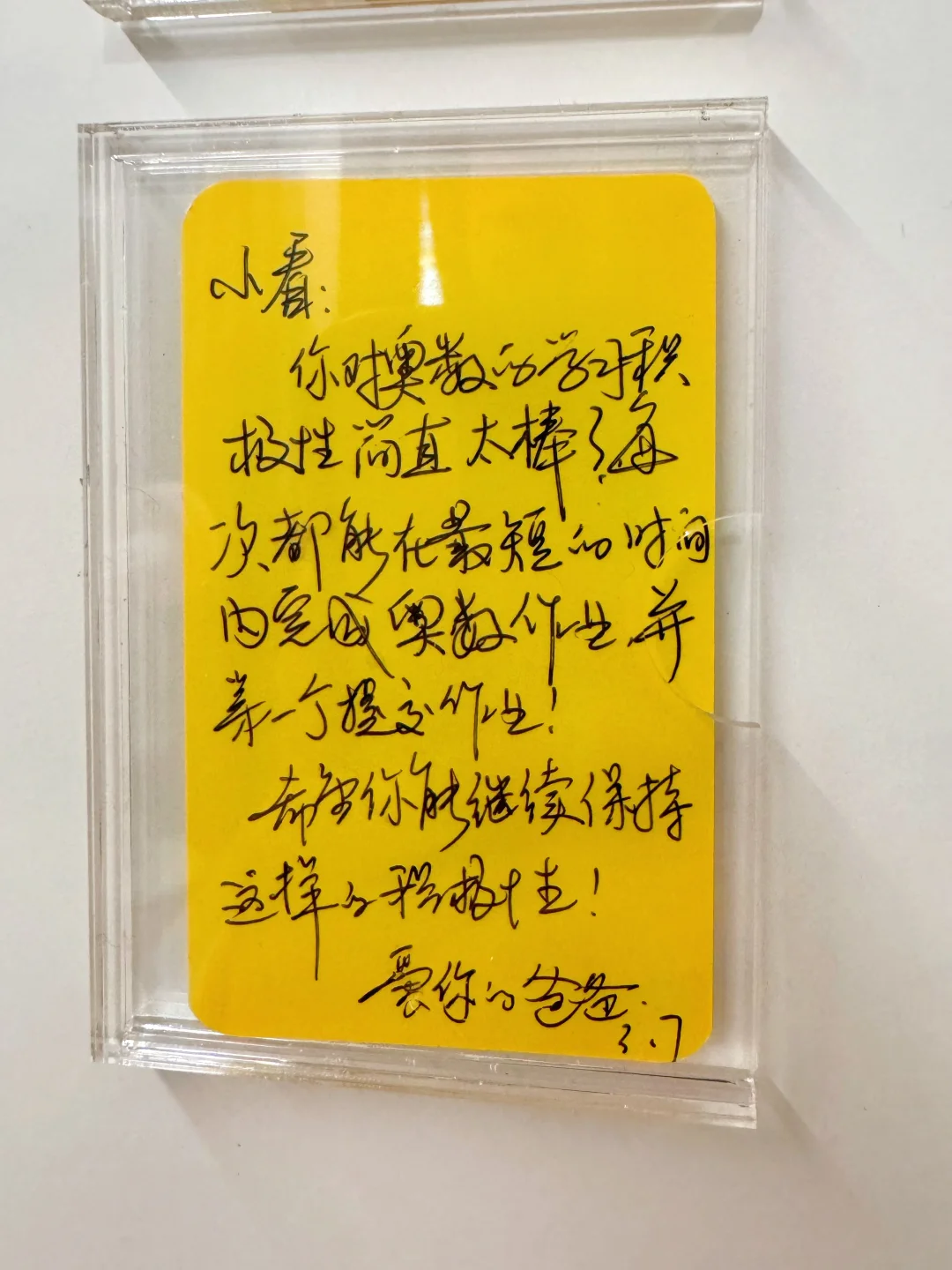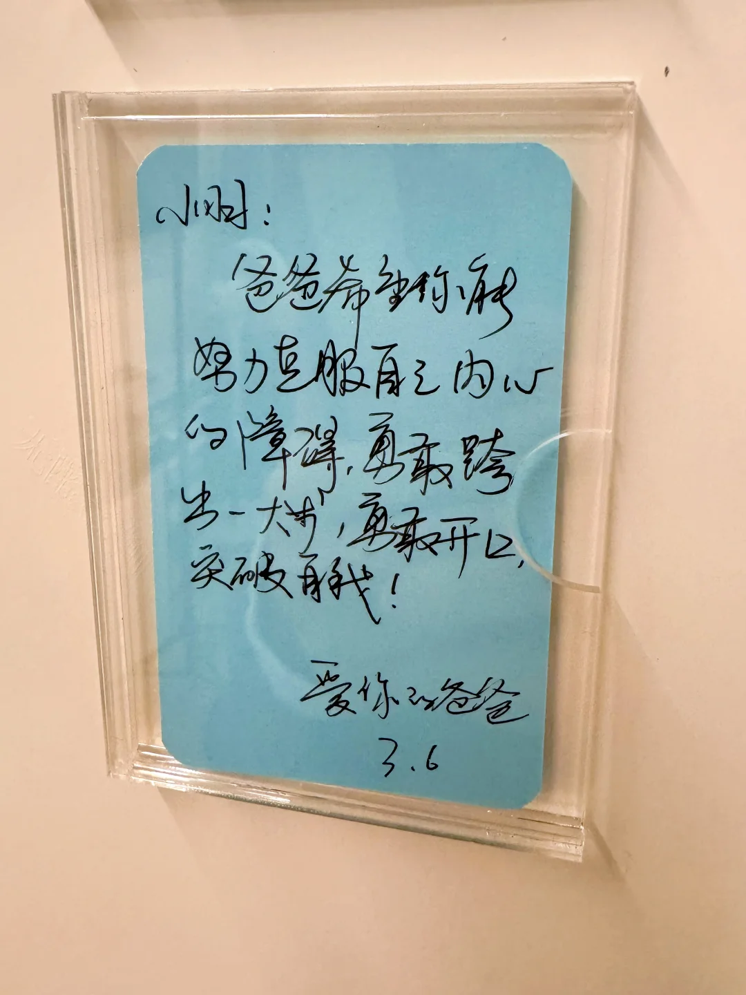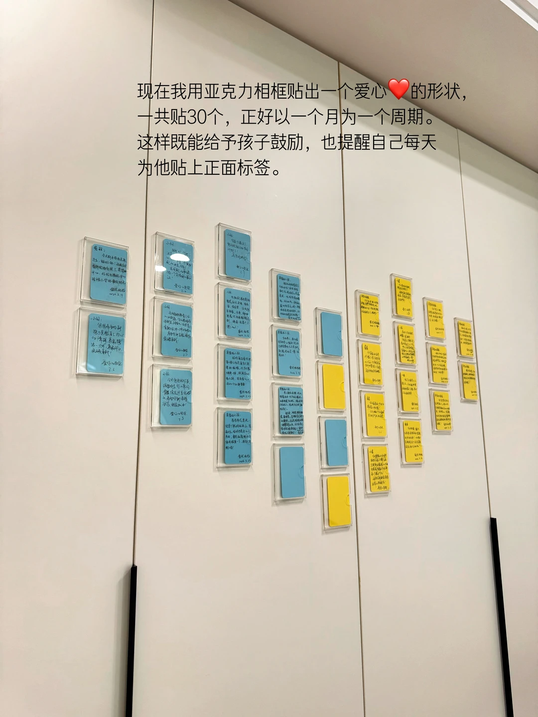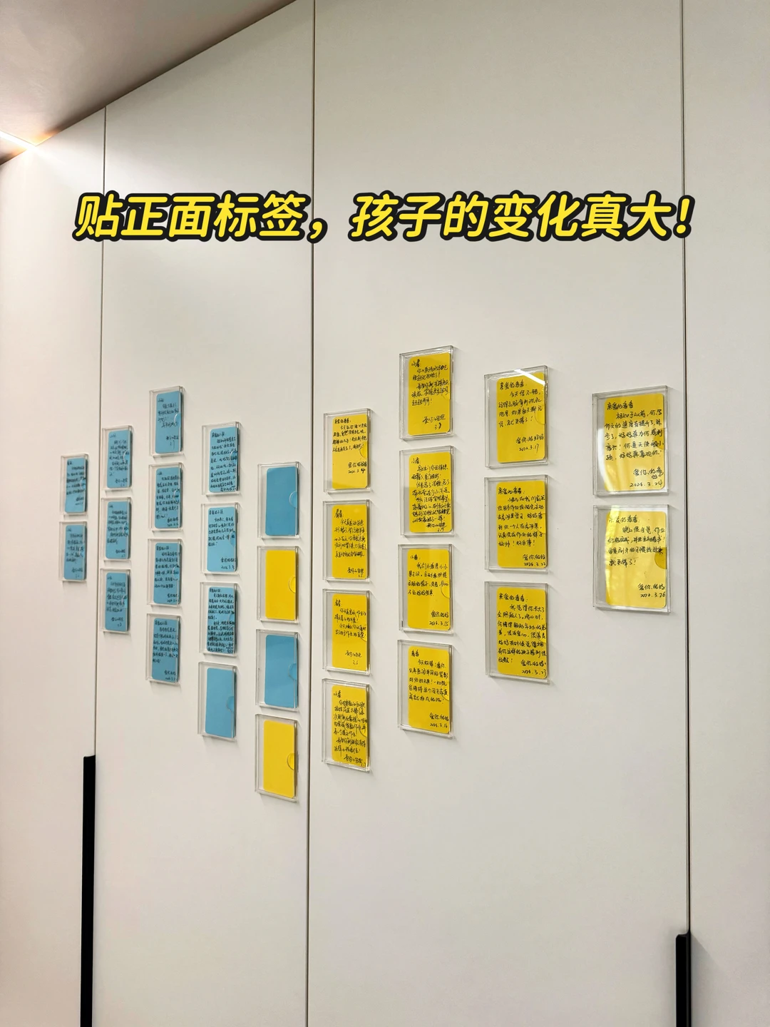 图中是3寸的双层亚克力相框,贴到柜门板上。写给孩子的正面便签这些年断断续续一直有在做,目的是鼓励孩子,提升孩子的自信心、唤醒自驱力以及时刻提醒自己对待孩子的方式,增进亲子关系。 原先是我一人在做,后来孩子爸爸也参与进来。这些年的坚持,最明显的改变是,小儿子从一个脾气暴躁、对立违抗的孩子慢慢成长成贴心善良的小可爱☺️ 未来不求大富大贵,只求我的孩子身心健康!我们继续努力💪