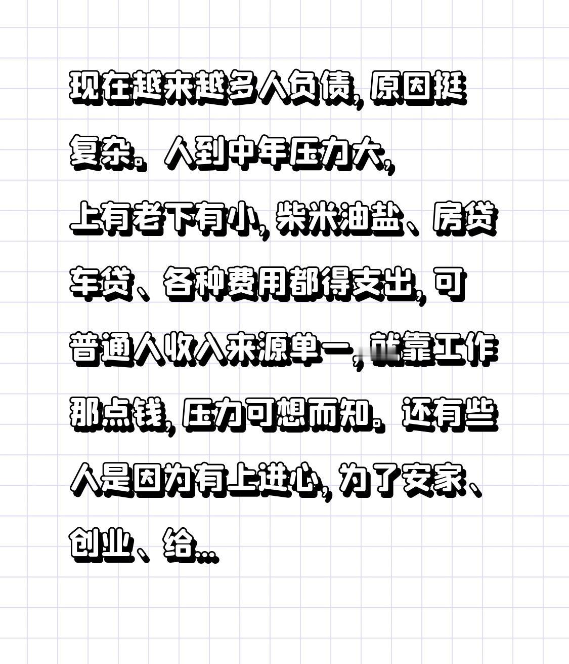 现在越来越多人负债,原因挺复杂。人到中年压力大,上有老下有小,柴米油盐、房贷车贷、各种费用都得支出,可普通人收入来源单一,就靠工作那点钱,压力可想而知。 还有些人是因为有上进心,为了安家、创业、给家人好生活,提前预支未来,背上债务。但市场残酷,很多人努力了却被债务反噬。 另外,心态也很关键,被压力逼到极致,产生负面情绪选择摆烂,只会让情况更糟。其实可以换个思路,停下来舒缓下内心。像我就会听听《追梦赤子心》给自己打气,接受现实,努力还债。