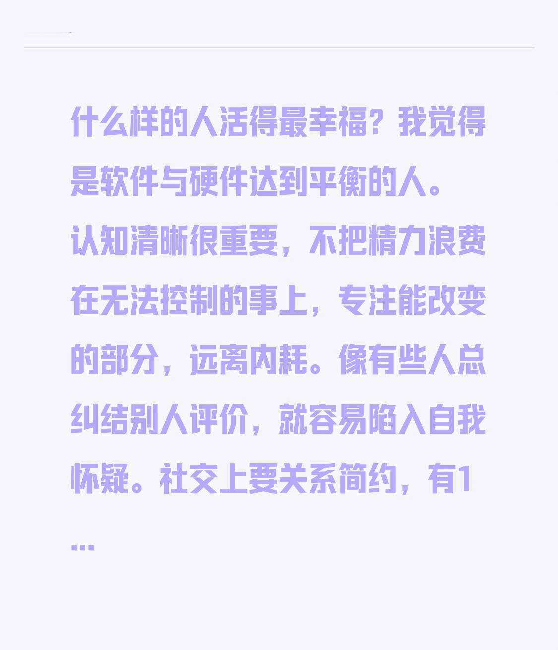什么样的人活得最幸福?我觉得是软件与硬件达到平衡的人。 认知清晰很重要,不把精力浪费在无法控制的事上,专注能改变的部分,远离内耗。像有些人总纠结别人评价,就容易陷入自我怀疑。 社交上要关系简约,有1 - 2个深度共情的老友,远离消耗自己的人。身体方面,保持规律作息和适度运动,让身体轻盈,精神才更愉悦。 此外,得有事可做,进入“心流”状态。就像老人学新东西,不为有用,只为有趣,这样每天都有盼头,幸福也就来了。