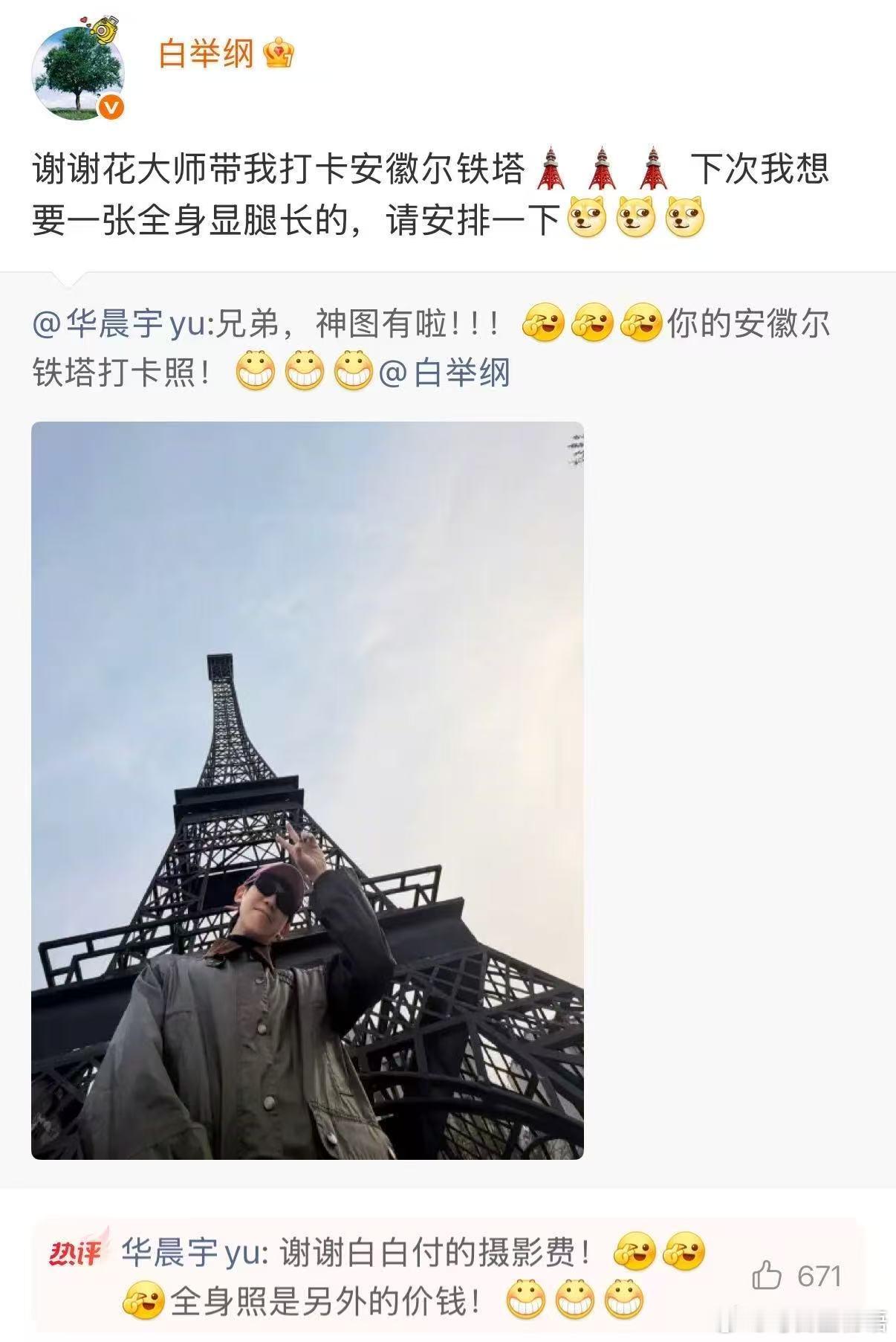华晨宇帮白举纲打卡安徽尔铁塔 谁懂这波兄弟互动有多好嗑,负责拍神图,白举纲负责在线夸“花大师”,顺便安排显腿长版本。照片是打卡,互动才是重点,这友情真的很舒服。