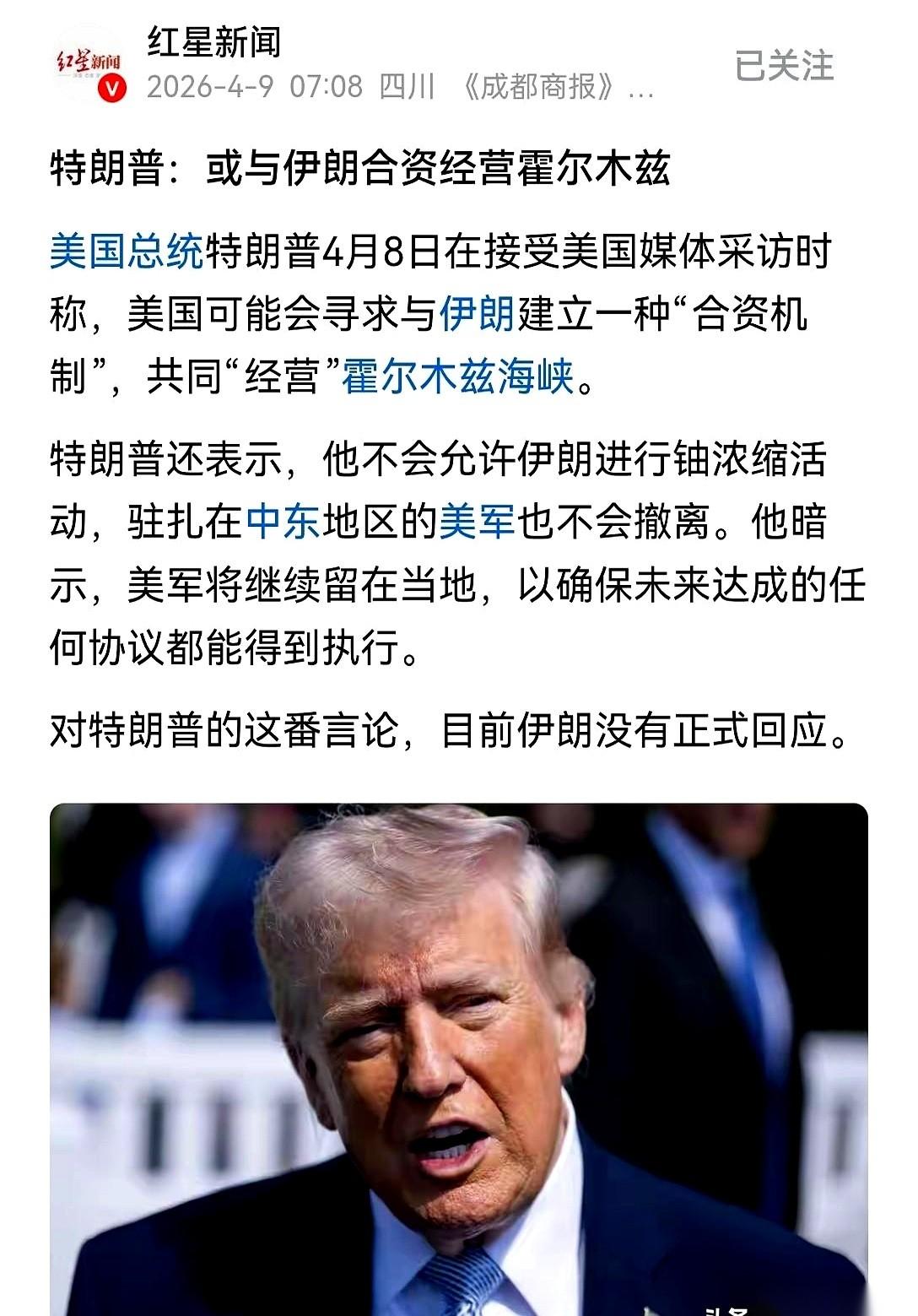 特朗普这人,真是把全世界的剧本都给撕了。 前一秒还剑拔弩张,战机在天上盘旋,下一秒他对着镜头,慢悠悠地抛出一个建议:要不,咱跟伊朗合伙吧? 在霍尔木兹海峡,搞个“合资企业”。 没听错,就是开战的那个伊朗。他说,两家可以一起经营,一起收费。 炮火声还没散干净,算盘珠子已经敲到德黑兰去了。 伊朗那边刚放出风声,说要给每桶过路的原油收一美元“保护费”。这账本一摊开,特朗普眼睛都亮了。 一天过两千多万桶油,那就是两千万美元。一年下来,七十多个亿,还是美金。这可是一分钱本钱都不用投,印钞机都没这么快。 他手里的地球仪,估计都不是按国家分的,是按收费站分的。 你以为他在下一盘大棋,其实人家只是想找个好码头,坐地收钱。 所以说,永远不要用常规思路去琢磨他。在他眼里,什么敌人,什么盟友,可能都不如一个能下金蛋的收费站实在。这到底是精明,还是疯了?