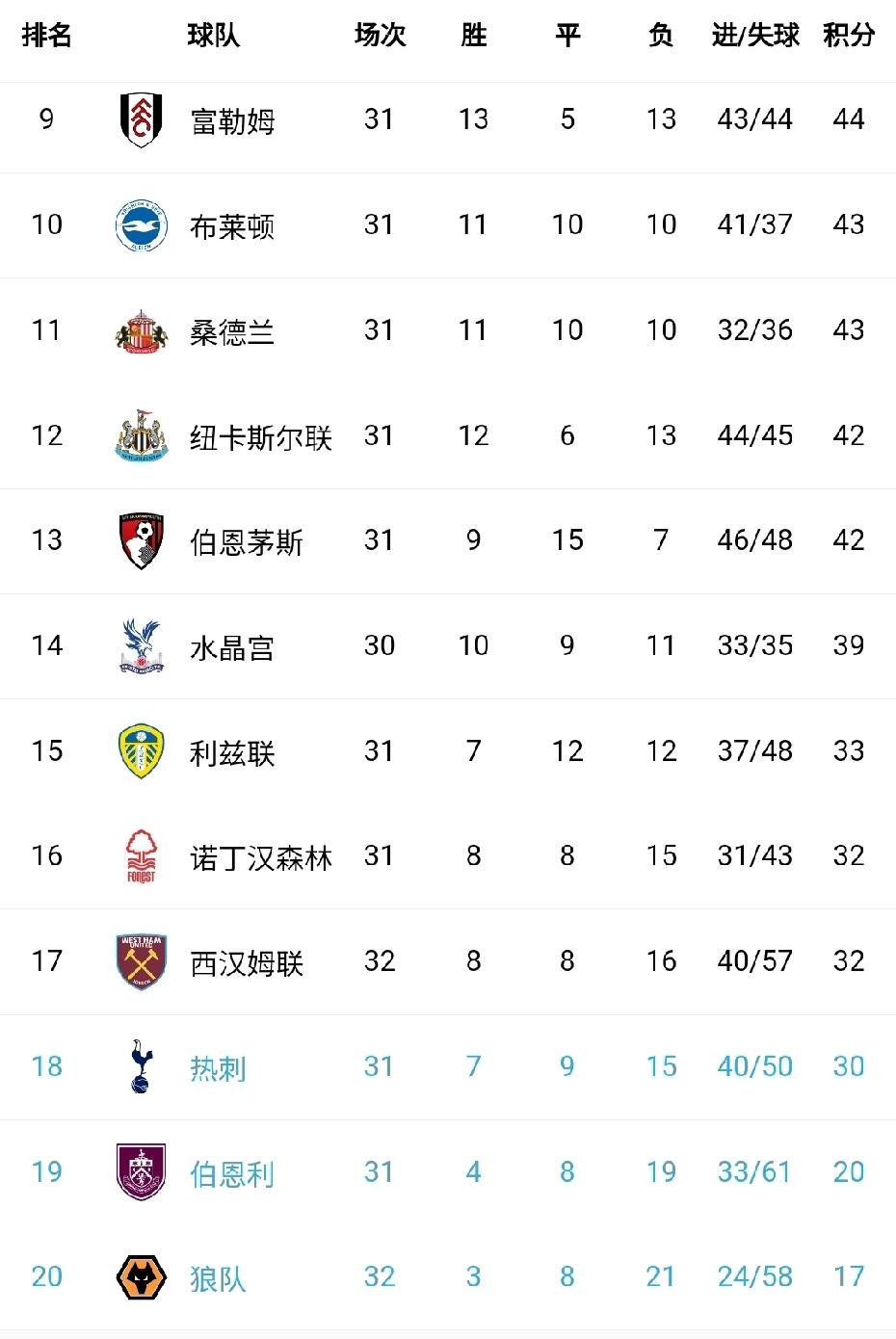 铁锤帮4-0大胜副班长逃离降级区,热刺跌入降级区。 保级大战白热化,平局等于输球。利兹联、森林、铁锤帮、热刺抢一个降级名额。热刺已经换帅,森林还有欧战任务,铁锤帮占据赛程优势。