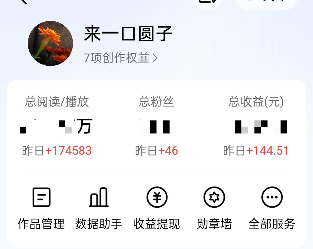 祝贺一下自己!在今日头条进行创作一年来,单日创作收益首次达到三位数。 我是2025年2月注册头条账号开始进行创作的,至今已经有13个月多一点时间。 说实话,我的目标很明确。进入头条,就是为了通过努力给自己赚一点零花钱。 不过,进入头条以后才知道,头条的江湖,和我想象中的的确有点不太一样。 对于写稿,我有一点基础,毕竟给纸媒和网站写稿多年,但是在头条想获得创作收益,却不是一件轻松的事。 社交媒体和传统媒体完全不同,前者看的是流量,后者看的是质量。所以在头条,如果没有流量,质量再好的作品也是白搭。 问题的关键是,没有人知道流量密码到底是什么。你巧妙构思、精心润色的精品力作,发布出去极有可能无人问津。 你永远不知道,什么样的词语或金句可以激发平台的推送机制,为你带来泼天流量,而这正是头条让你欲罢不能的地方。 很多人都会这样想,今天的作品没有流量,说不定说不定明天就有了呢!于是,在头条的日子就这样一天天过了下去。 每次看到那些头条的大V们晒收益,我都羡慕不已,每天都是好几百,而且相对比较平稳,真的是实力打底,运气爆棚。 我没有那么好的运气,实力也有限,因此今日头条开始写作以来,创作收益惨不忍睹。 而且,虽然我的创作均衡,每天都更新作品,但是日创作收益波动很大,最少的时候只有几分钱,大多数情况下是在几角到几元不等,几十元的很少。 昨天,我打开手机看收益的时候,吓了我一跳,昨日收益一栏显示的金额居然是144.51元 ,这是进入头条创作以来,单日创作收益首次达到三位数。 我知道,对我而言,日入三位数绝不会常有,每天几块钱才是常态。但是我相信,只要初心不变,惊喜便会自来。