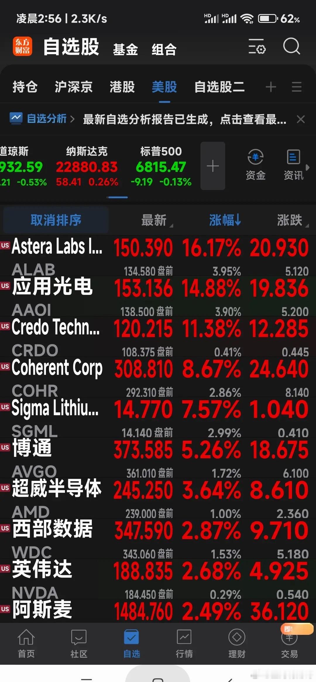 美股光通信今夜大涨!光通信真是太强了!今晚美股开盘三大指数涨跌互现,光通信概念暴涨!Astera Labs大涨超16%,应用光电大涨近15%又创历史新高,Credo Technology大涨超11%,Coherent大涨超8%,创历史新高,康宁涨超1%历史新高,Lumentum涨超1%。美伊战争以来光通信和存储才是最好的避险板块。结构性牛市,买对股票天天吃肉,买错股票天天挨打[捂脸]现在的A股是不是越来越像美股?指数上涨,大部分个股下跌,仅仅少数龙头公司推动指数上涨。赚钱越来越难了!