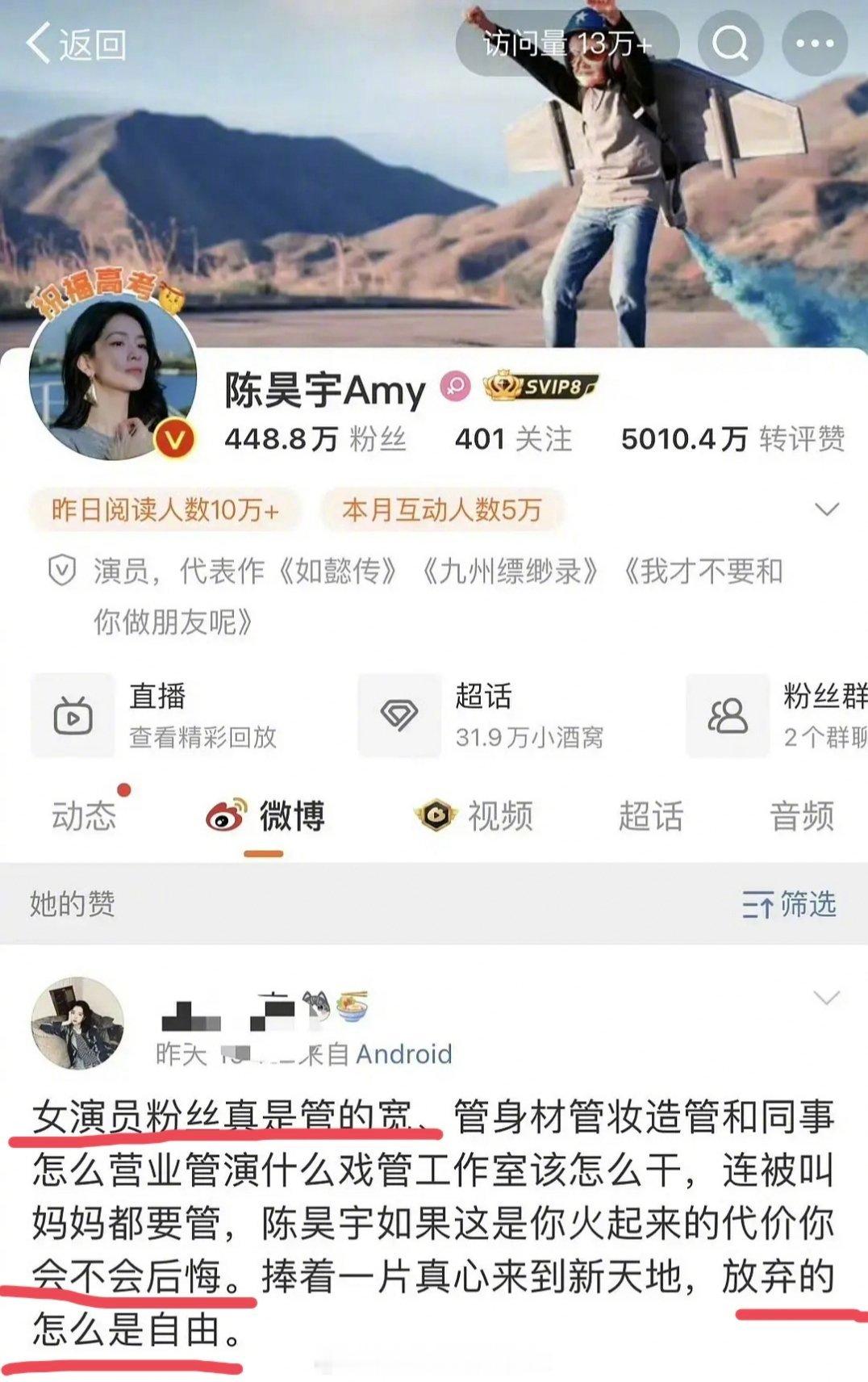 陈昊宇为什么这么喜欢训粉?点赞了粉丝管太多丧失自由的博文,之前也为了维护工作室怼粉。
