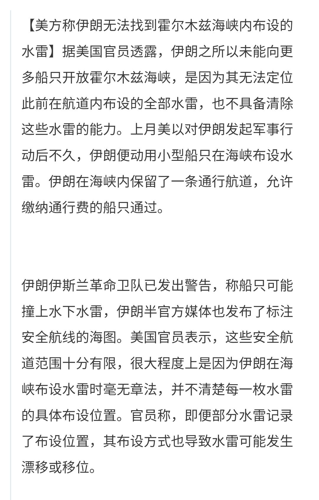 大事不好,霍尔木兹海峡很难全面通行 在美国3月份对伊朗发起攻击后不久,伊朗就用小船布置了水雷,仅仅留下了一条窄窄的通行航道。 由于伊朗布置水雷的时候没有全部标注位置,即使部分标注了位置,也有一些水雷会随水流漂离,导致现在绝大部分的水雷位置不能确定,给排除水雷带来了很大的麻烦,排除水雷很难在短期内完成。 现在霍尔木兹海峡上只有一条窄窄的通行航道,但如果那些水雷随着水流漂移到这条航道内,这条航道也就变得不安全了,油轮也就不能在霍尔木兹海峡内自由航行,即使美伊双方谈判成功,霍尔木兹海峡全面自由通行也不是短时间能解决的。 这个消息会影响油价的走势,油价应声而涨应该是大概率的,油价的上涨会促使股市的下跌,股市的下跌会让我们的基金亏损,但愿能够很快排除这些水雷,但愿美伊能够谈判成功。 今天下午,美国和伊朗将在巴基斯坦的伊斯兰堡进行谈判,美国是以副总统万斯为首席谈判代表,伊朗是以议长为首席谈判代表,会谈之前双方都有强硬表态,这些都是表明姿态,会谈现场的气氛会更加的火爆。 停火三天以来,美国的兵力布置并没有停止,武器弹药的补充一刻都没有停,伊朗当然也不会休息,他们急须修补被炸坏的导弹发射装置,他们急需补充见底的导弹弹药,有一处被炸毁的铁路大桥,伊朗人在三天之内就把它修复,现在已经有火车在上面通行,停火休战期间并不给双方以喘息的机会,如果谈判失败,停火休战随时随地就会结束,再一次的战争肯定是更加的猛烈,相信到时候伊朗会给美国人来一个更大的教训,让世界人民知道,美国人的实力并不是想象的那么强。 你觉得这一次谈判能不能成功?你觉得如果谈判成功后,能不能很快排除掉这些水雷?你觉得再一次爆发成功的可能性大不大?