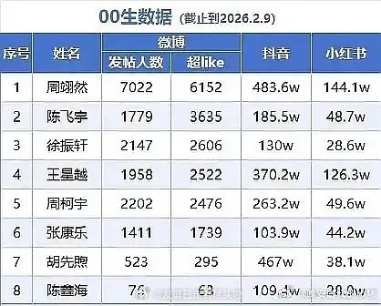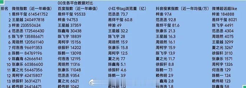 00生最大的也26了,但是剧圈跑出来的连个四大都凑不齐,也就陈飞宇,王星越算冒头了,周翊然空有买股还缺实绩,剩下周柯宇,张康乐,徐振轩继续努力看能不能弯道超车吧