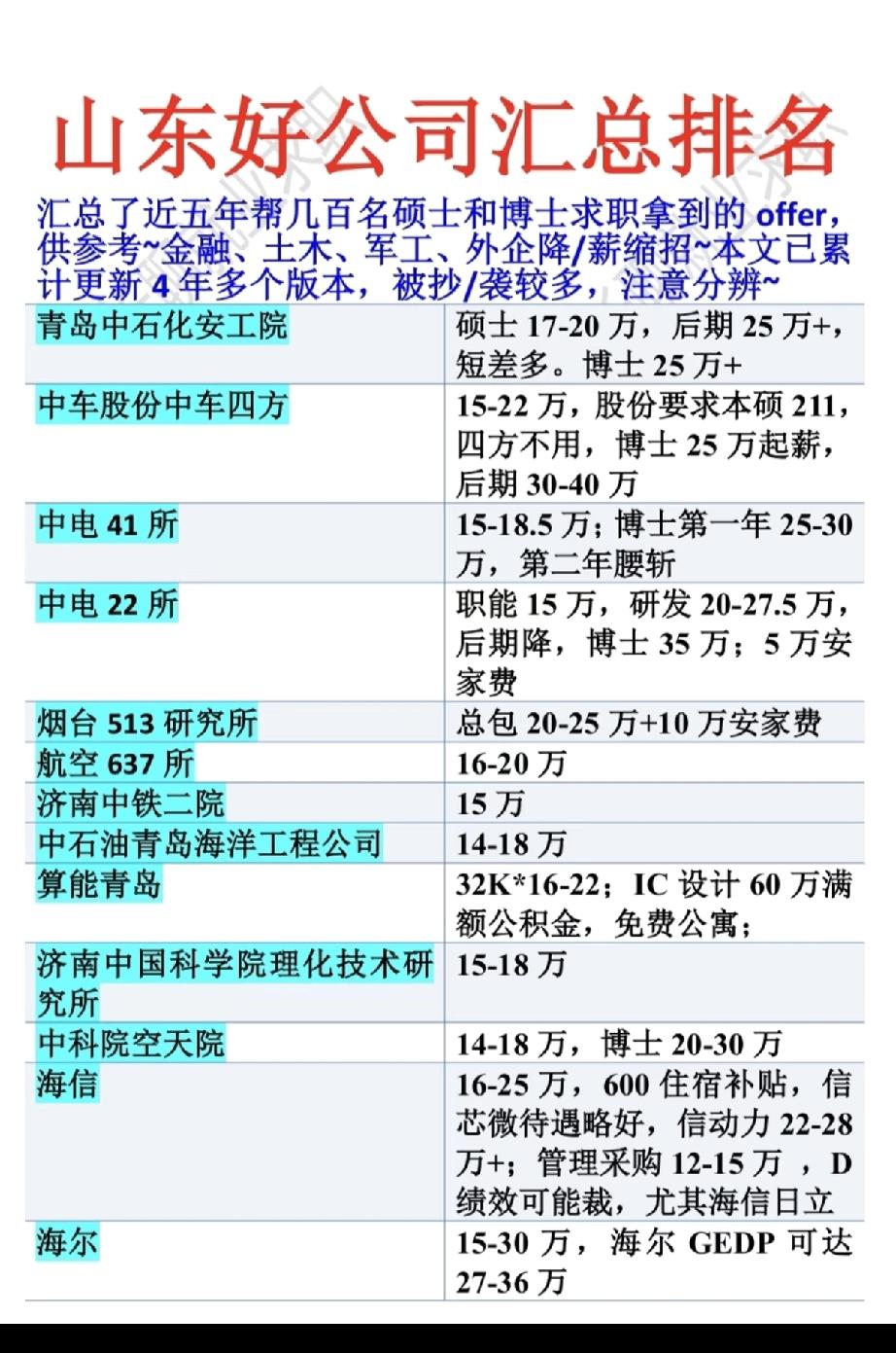 山东好公司待遇排名汇总 汇总近5 - 6年帮几百个硕士博士学员求职拿到的山东青岛、济南等地offer,供参考。 金融行业和运营商降薪,后期工资上限降低,军g研究所因项目订单少、利润受限也在降薪。想去山东好公司需提前准备。外企裁员多,还有撤离情况。 帮助学员拿到以下青岛、济南等地好公司offer: 青岛中石化安工院、中车四方、中电41所、中电22所、烟台513所、航空637所、济南中铁二院、中石油青岛海洋工程公司、中科院理化所济南、中科院空天院、海信、海尔、一汽大众青岛、歌尔、山东省科学院自动化研究所、一汽解放、中建八局机关、山东高速、中联油、芯恩、潍柴、华能石岛湾、中船船舶设计研发中心、山东电工电气、中电装备、重汽、光大银行青岛、中国电信省分、联通研究院、移动山东省分、济南医工所、海油铁二院北方设计院、青岛民船研发中心、山东核电、中铝山东、济南先进电磁技术研究院、四方阿尔斯通、比亚迪、浪潮、万华、中科院电工所济南、哈焊机青岛分部、山东中建、华能信息青岛、安德烈斯蒂尔(德企)、中广核烟台、中电科金仓、山东中科产创中心、中科光物理院、中科院声学所北海站、青岛海洋研究院、烟台现代汽车研究院、青岛北海造船厂、工农中建交邮储等国有行省分行(中行略低)、中国银行审计部青岛分部、中信、招商、浦发、兴业、华夏、恒丰、齐鲁、青岛银行、青岛农商行、山东电力咨询、济南水利设计院、新奥燃气、青岛宏大纺机、杰瑞、山东广播电视台、京东方、拼多多管培、青岛啤酒、青岛地铁、特来电、沃尔沃建筑设备济南研发中心、中远海运青岛、中兴、中海油济南研究院、山东临工、山东省联社、电信/联通/移动市公司(青岛济南)、华为济南研究所、济南铁路局信息所、中泰证券、青岛港、豪迈集团、碧桂园、中国兵器53所、济南二机床、趵突泉实验室、济南能源工程、山东滨达实业、中材锂膜、北京汽车制造厂、字节跳动、海康威视山东、高测、中船重工、电科思仪、新希望六合、澳柯玛、济南钢铁、人保财险青岛、赛轮轮胎、山东能源、华熙生物、吉利、中粮、齐鲁制药、百威管培生、科大讯飞