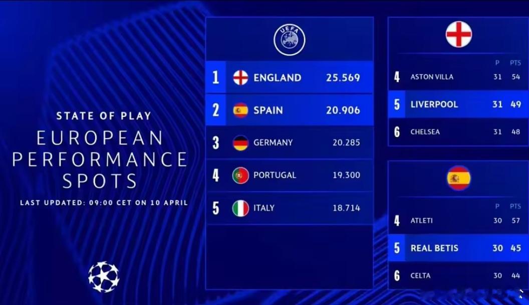 欧足联官方今日将各大联赛欧战实时积分情况进行公示,确认英超将在下赛季保有5个欧冠席位。与此同时,西甲与德甲将围绕另一个额外席位继续展开竞争。