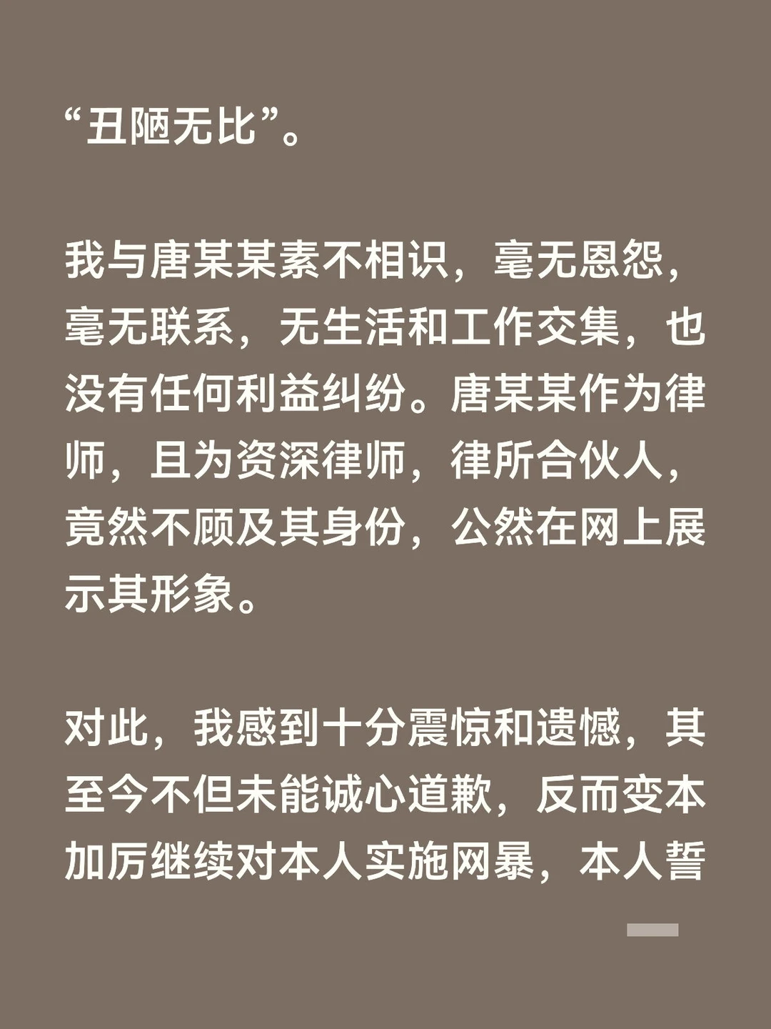 我与唐某某素不相识,毫无恩怨,毫无联系,无生活和工作交集,也没有任何利益纠纷。唐某某作为律师,且为资深律师,律所合伙人,竟然不顾及其身份,公然在网上展示其形象。