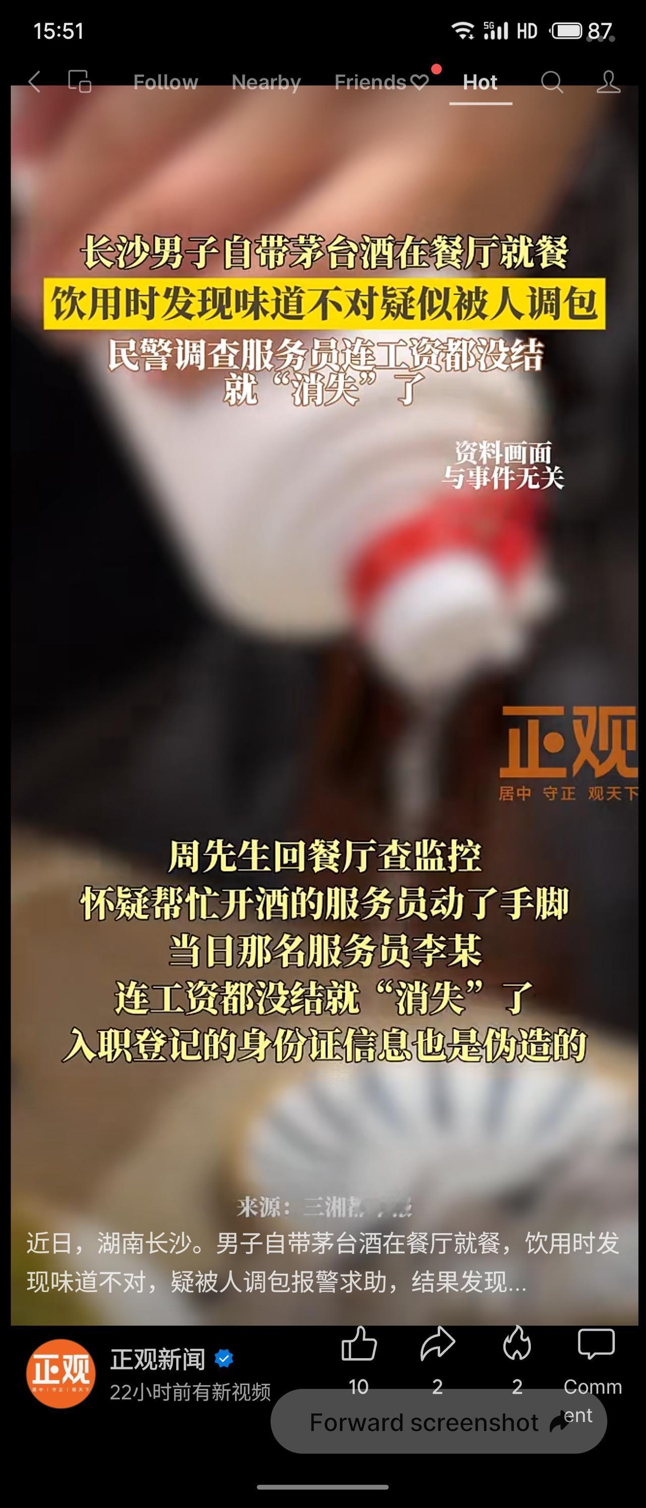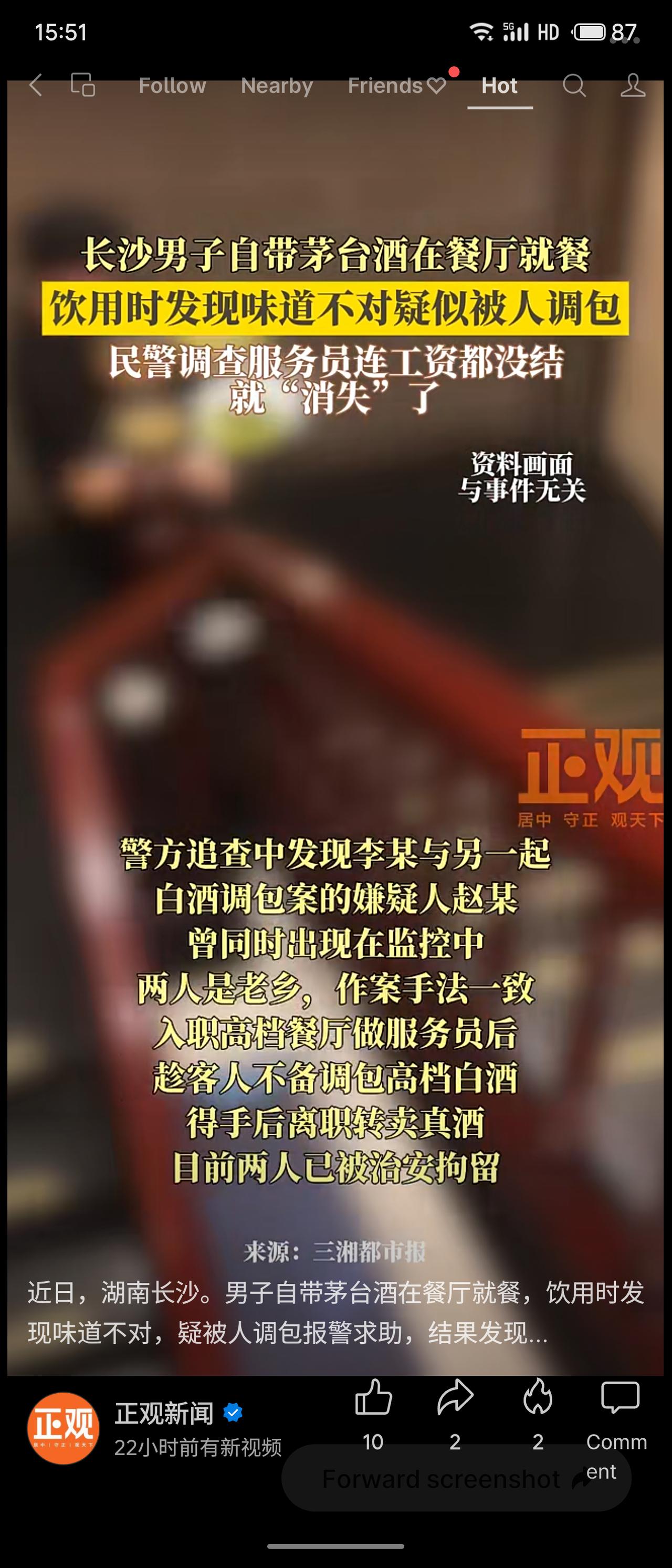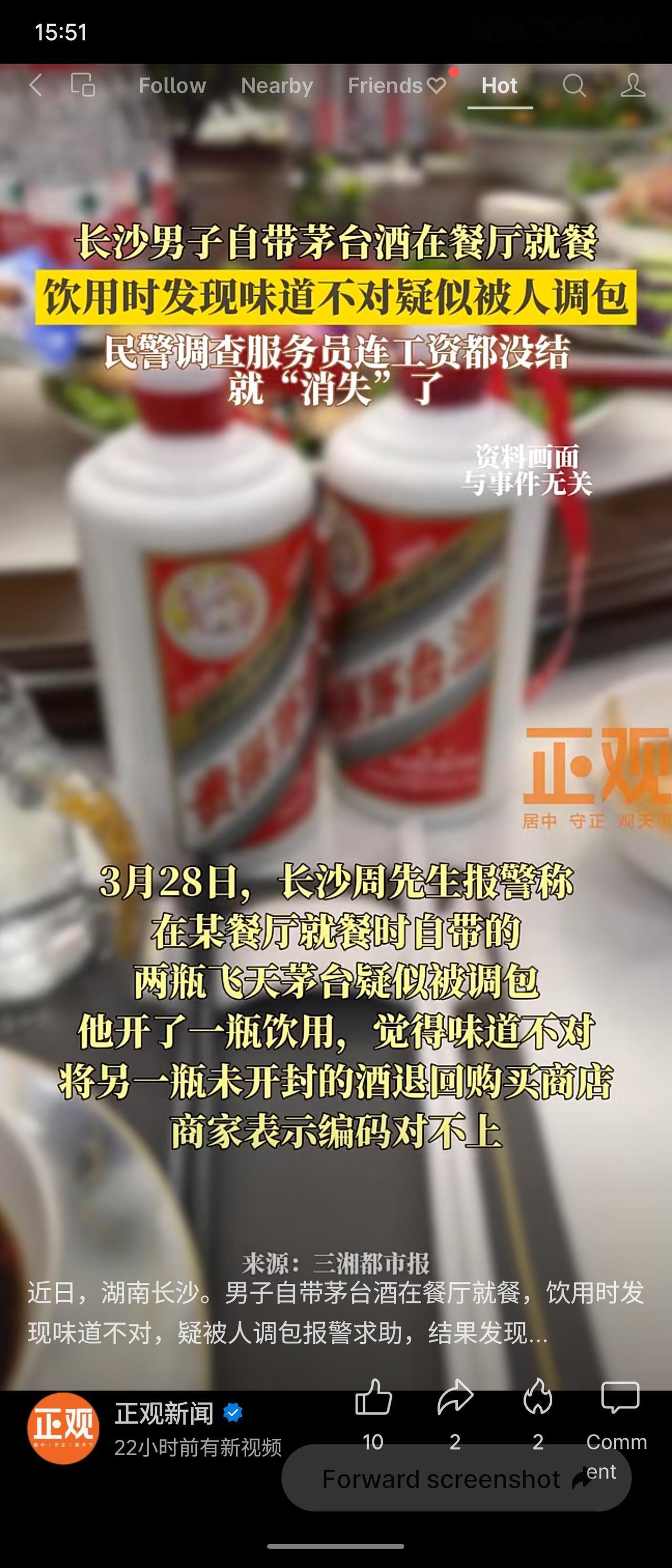 长沙周先生自带两瓶飞天茅台就餐,饮用时察觉味道不对,未开封的一瓶退回商店发现编码不符。报警后,帮忙开酒的服务员李某连工资都没结就“消失”,入职身份证系伪造。警方追查发现,李某与另一起调包案的赵某是老乡,手法一致:入职高档餐厅,趁客人不备调换真酒,得手后离职转卖。目前两人已被治安拘留。 此案暴露部分餐饮服务人员利用临时身份作案,伪造证件、快速离职,监管与背景审核缺失。消费者自带贵重酒水需谨慎,餐厅也应加强员工登记与监控,避免信任被滥用。警方跨案并查值得肯定,但防微杜渐更关键。