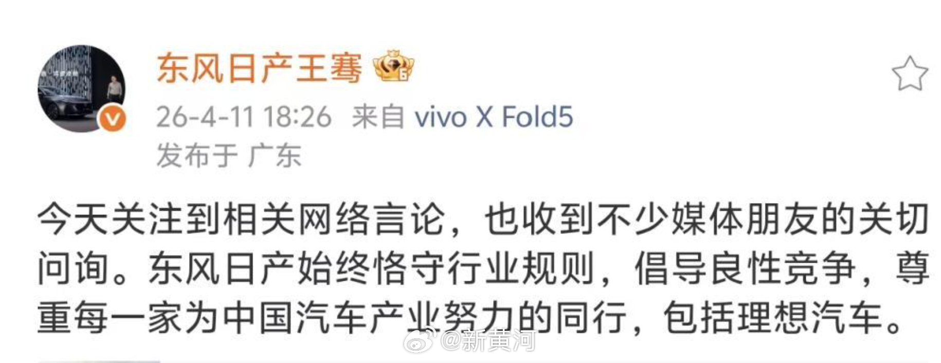 【#东风日产高管回应李想炮轰# :东风日产尊重每一家同行,包括理想汽车】#李想朋友圈飙脏话# 4月11日,东风日产汽车销售有限公司新能源品牌总经理王骞发文,回应理想CEO李想在朋友圈炮轰一事。