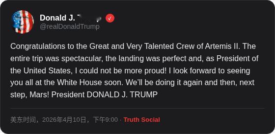 “下一步,火星!”特朗普发文祝贺阿尔忒弥斯2号任务成功。 他在贴文中说: 恭喜阿尔忒弥斯二号的伟大而极具才华的全体机组人员。整个旅程非常壮观,着陆完美无缺,作为美利坚合众国总统,我感到无比自豪!期待很快在白宫见到你们所有人。我们会再次出征,然后,下一步,火星! 总统 唐纳德·J·川普 (美东时间,2026年4月10日,下午9:00)