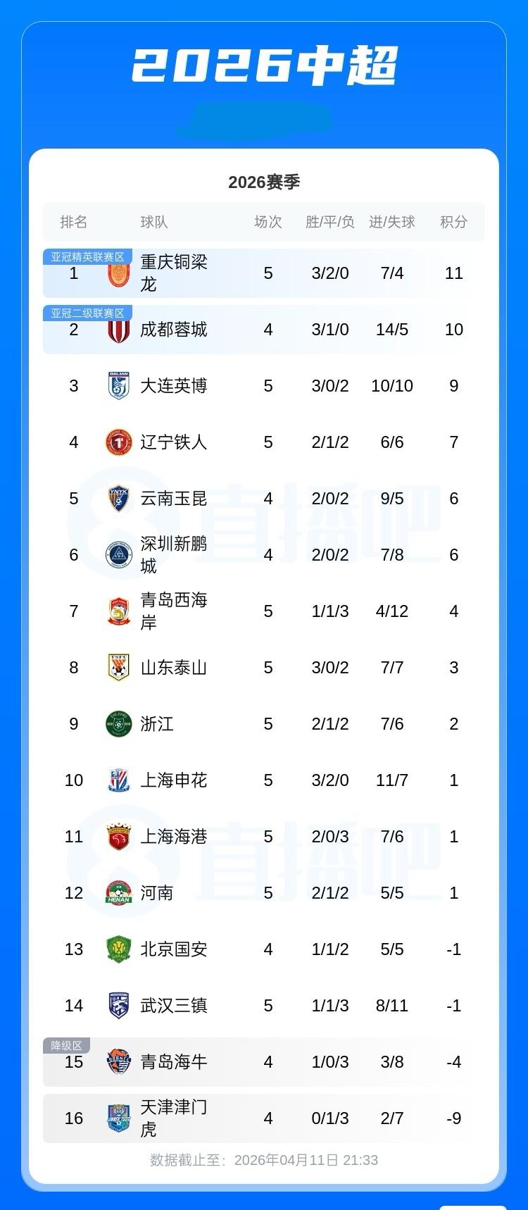 中超最新积分榜:铜梁龙先赛积11分暂登顶,申花积分回正 积1分第10海港同分第11 04月11日 中超第5轮 上海申花主场1-0战胜上海海港 河南0-1山东泰山 重庆铜梁龙2-1武汉三镇 青岛西海岸1-1辽宁铁人 最新积分榜上:铜梁龙先赛积11分暂登顶,辽宁铁人积7分第4,青岛西海岸4分第7,泰山积3分升第8,申花积分回正 积1分升第10,海港积1分第11,河南积1分居第12,武汉三镇积负1分暂列第14名
