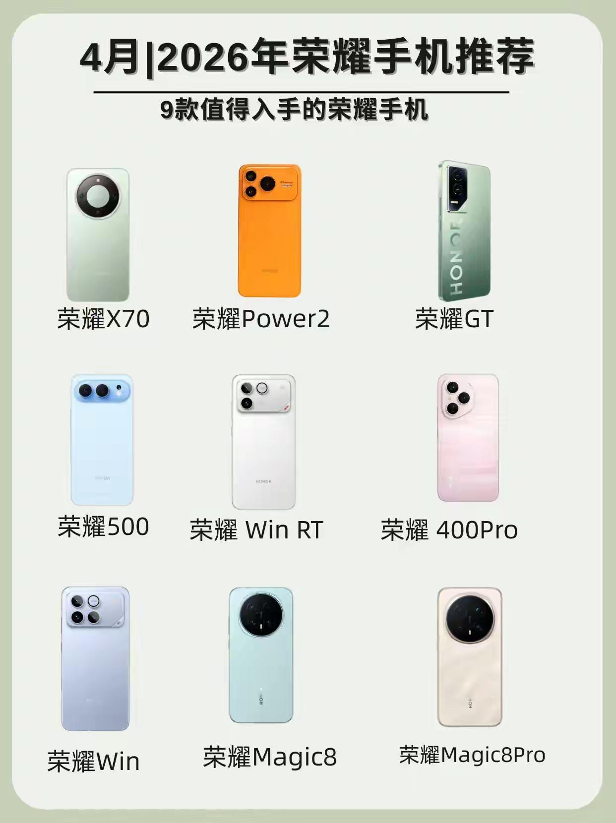 2026年4月荣耀购机指南,别再只盯着苹果三星,荣耀这波直接把全价位卷到天花板。Magic8 Pro用骁龙8至尊版+2亿潜望长焦,4499起的定价直接把高端机价格打下来,商务娱乐全能打。Power2塞下10080mAh青海湖电池,两天一充直接终结续航焦虑,追求极致续航首选。学生党千元档选X70,抗摔耐用+长续航,长辈用也省心。中端市场GT系列性能拉满,影像党400 Pro的2亿主摄随手出大片。从千元档X70到全能旗舰Magic8 Pro,9款机型覆盖所有需求,闭眼入都不踩坑,国产手机不仅能打,还能把配置和价格卷到极致,这才是真正的国民旗舰。