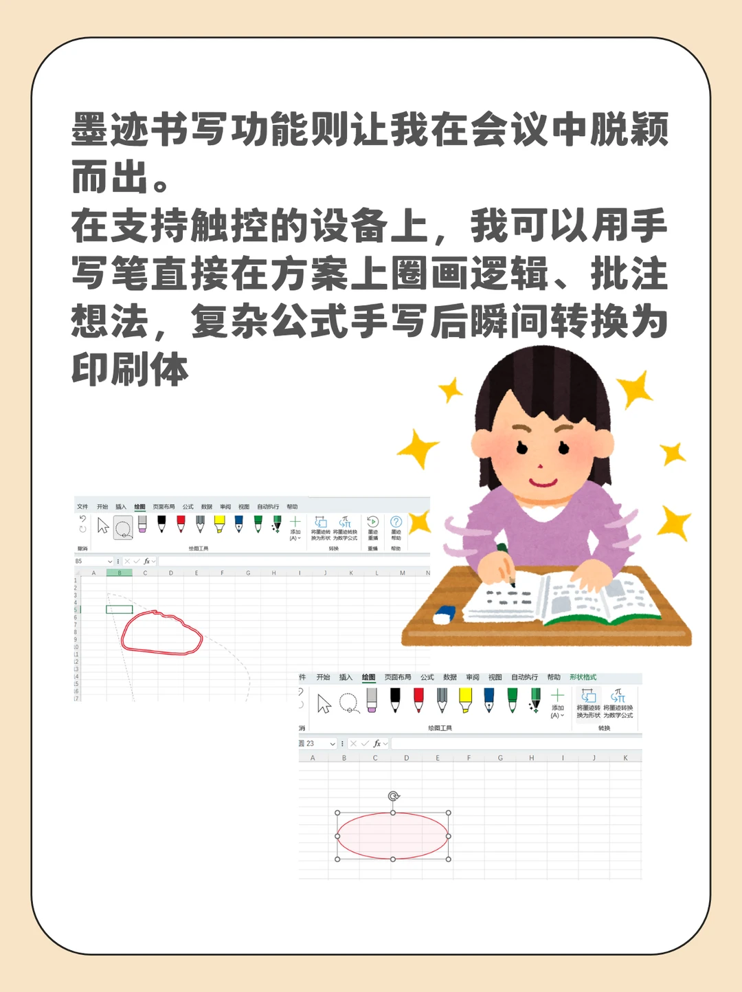 [向右R]墨迹书写功能则让我在会议中脱颖而出。在支持触控的设备上,我可以用手写笔直接在方案上圈画逻辑、批注想法,复杂公式手写后瞬间转换为印刷体。这让沟通变得直观、生动且充满个人印记,专业形象不言而喻。