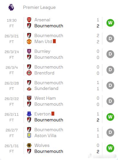 🍒战胜阿森纳后,伯恩茅斯已经连续12轮英超不败。上次输球是今年1月主场不敌阿森纳
