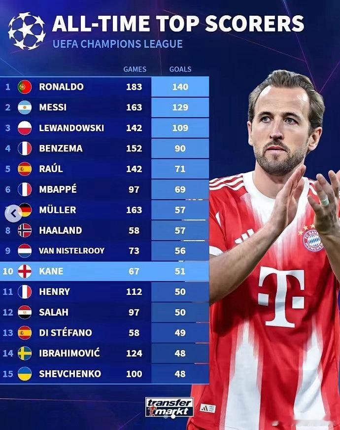 欧冠警报!凯恩前67场欧冠进球追平梅西!在拜仁2:1胜皇马的比赛中,凯恩打入1球,至此他在欧冠前67场已进51球,这一神迹追平梅西,目前以51球排在前67场进球榜第2,第1是范尼的53球。欧冠历史进球榜上,凯恩67场51球排第10。凯恩在热刺几年耽误不少,年轻姆巴佩欧冠已出战97场,超30岁的凯恩才67场。凯恩进球效率虽高,但年龄渐长,欧冠历史排名大幅提升难,能否进前5存疑。足球欧冠联赛凯恩