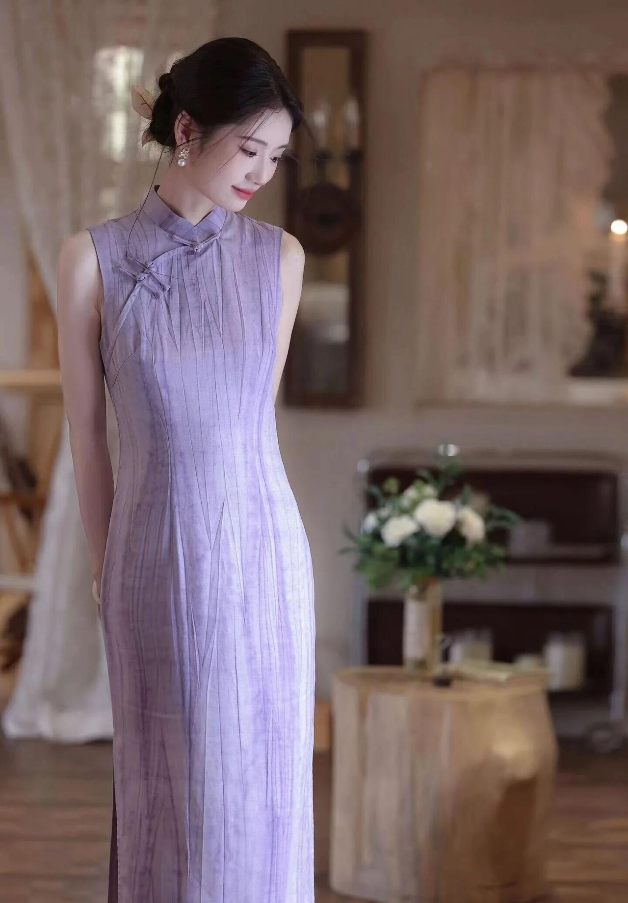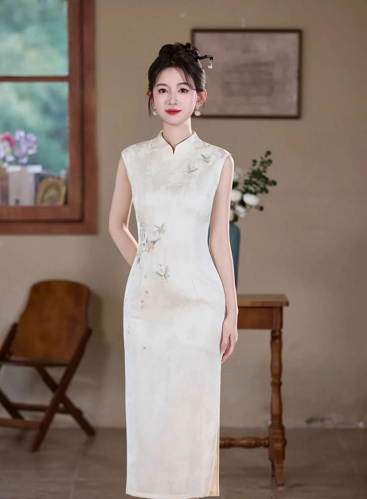 新中式旗袍写真全解析 整体风格 全屋温润复古室内布景,暖调柔光氛围感拉满,清一色改良无袖长款旗袍,把东方温婉雅致的气韵完美呈现,一衣一韵,古韵十足。 五款旗袍细节盘点 米白刺绣款:立领无袖版型,暗纹提花底布+精致蝴蝶花卉苏绣,清雅干净,温婉大小姐气质,温柔圣洁。 暖橘扎染款:晕染水墨禅意纹样,盘扣侧边设计,复古法式氛围感,温柔慵懒,自带旧时光故事感。 藏青暗花款:沉静雾蓝调植物提花面料,端庄大气,冷艳贵气,清冷民国千金氛围感极强。 黑格纹极简款:低调菱格肌理面料,珍珠盘扣点缀,简约干练,清冷知性,日常通勤也能驾驭。 芋泥紫竖纹款:低饱和雾面薰衣草紫,竖向肌理面料,温柔仙气,淡雅清冷,江南温婉诗意拉满。 ✨ 造型细节 统一低盘发新中式发型,搭配耳饰、发簪古风小配饰;淡妆红唇点睛,修身收腰版型完美勾勒身段,侧开衩设计雅致又灵动,每一套都自带东方古典韵味。