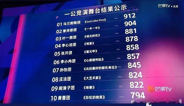 浪姐一公全部舞台的票数乌兰图雅团 《Just Like Fire》912票曾沛慈团 《一半一半》904票叶一茜团《城北的花》 881票李心洁团《雨爱》878票张月团《霍元甲》858票李小冉团《心愿便利贴》 857票孙怡团《此刻最好的都在身边》 845票庄法团《大艺术家》 824票阚清子团 《咏春》822票 萧蔷团 《彩虹的微笑》794票浪姐 投票标准