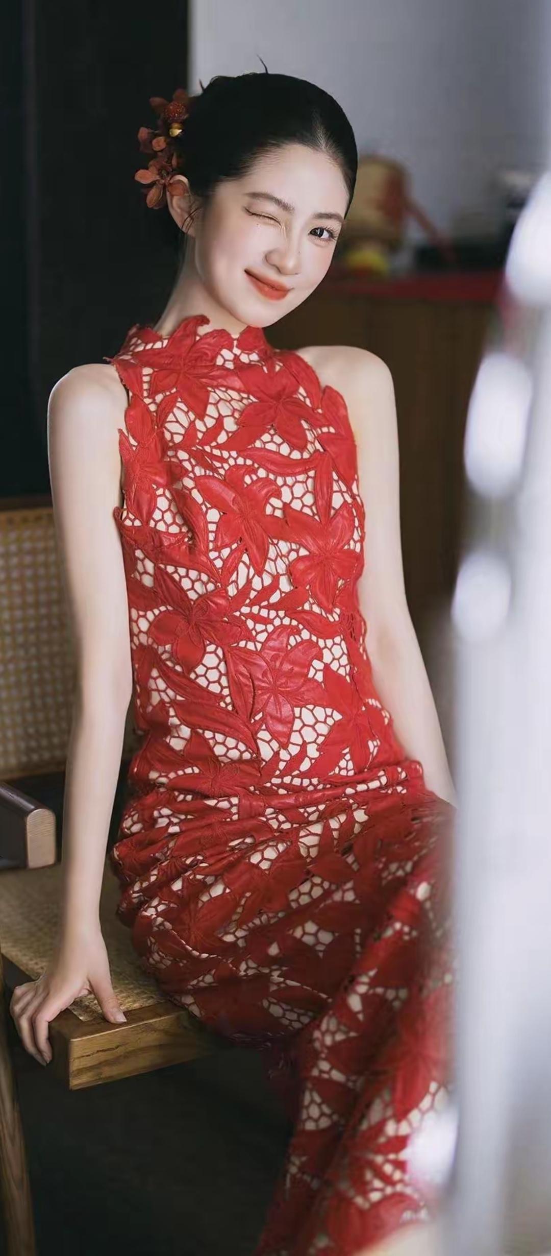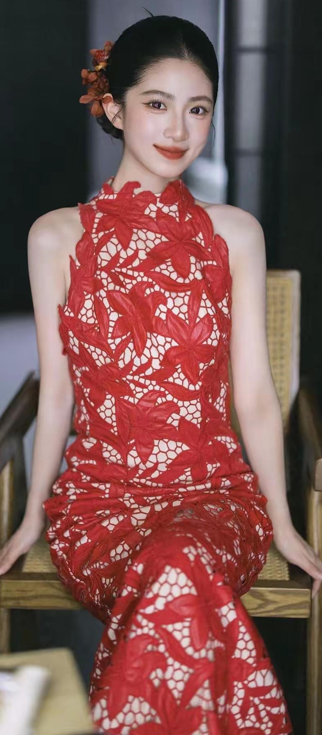 红衣美人倚墙立,笑靥如花映日红。