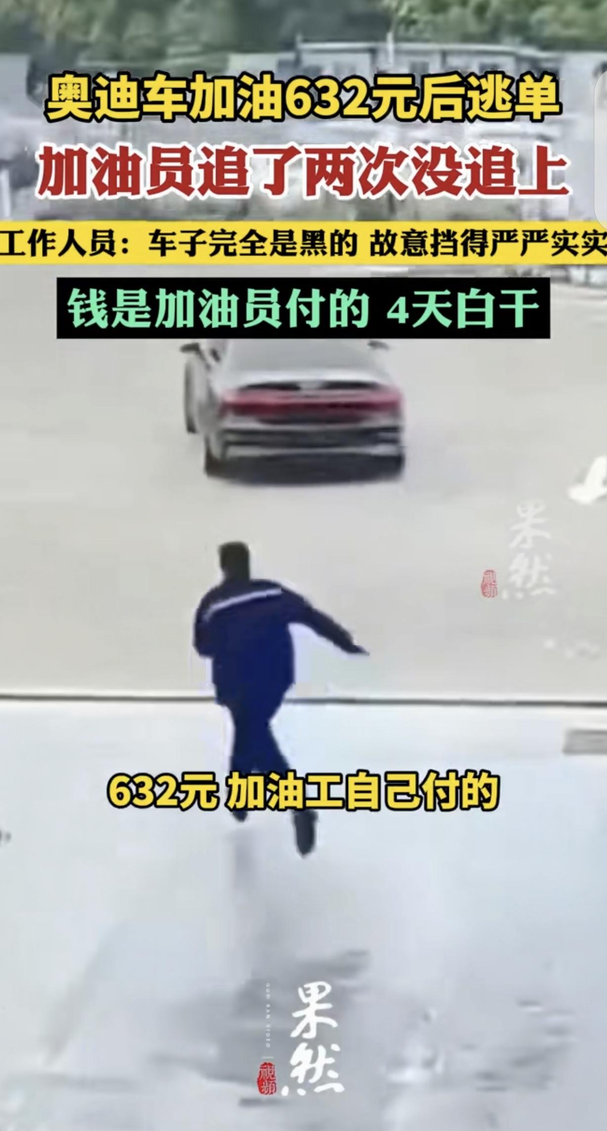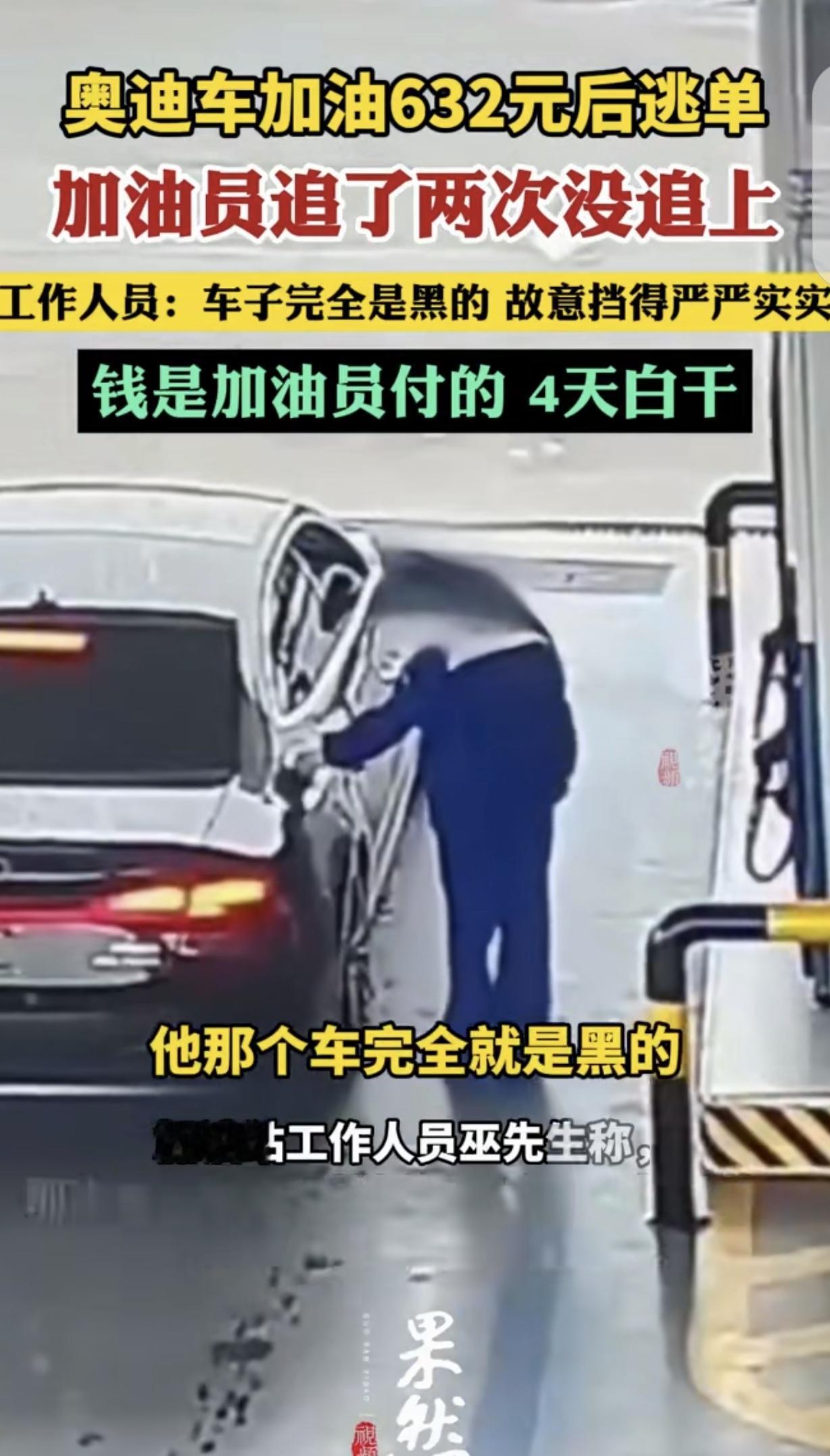 安徽合肥,一车主开着无牌照奥迪,去加油站加了632元的油,奇怪的是,车主的车窗全是黑色的,挡的严严实实,看不到里面,不知道车主是男是女?对方也不下车,不料,加完油,车主不付钱,一脚油门撒丫子就跑,加油工追了2次没追上,自掏腰包支付了632元邮费,4天白干了。网友:为什么逃单损失,要员工自己拿工资赔偿? 4月11日,据齐鲁壹点报道,安徽合肥的一个加油站,最近出了件让人窝火的事儿。 那天跟往常一样,加油工正按部就班地给来往车辆加油。 这时,一辆没挂牌照的奥迪车开了过来。 这车怪得很,车窗贴的膜黑得离谱,从外面瞅进去,连里面有没有人、是男是女都看不清楚。 车停稳后,加油工凑过去想问问加几号油?结果喊了好几声,车里的人也没应声,更没下来的意思,只从车窗缝里,做出一个把油加满的手势。 没办法,加油工只能照着平时的流程,给这辆奥迪加了632块钱的油。 加完油后,她敲了敲车窗,等着里面的人付钱,可没想到,车突然“嗡”的一声发动起来,紧接着一脚油门就窜了出去。 加油工先是一愣,反应过来撒丫子就追。 可是两条腿的,怎么跑的过四个车轱辘,喘气的咋能追上喝油的?何况加油工还是个女子。 她先是在加油站里追了一段,眼看着车要开出站,又赶紧跑追了几步,可眼瞅着奥迪车疾驰而去,她只能捶胸顿足,放弃追赶。 加油工后悔不已,这辆奥迪车,从开进加油站,就形迹可疑,车窗遮挡的严严实实,还没车牌照,车主也不下车,就该引起她的警觉。 可她觉得,车主开这么好的车,应该不是逃单之人,没车牌照,可能是新买的车,还没来得及上,所以,她大意了。 回来之后,加油工越想越委屈,这632块钱的油钱,按照加油站的规定,得从她工资里扣。 算下来,她一天辛辛苦苦也就赚100多块,这一下相当于白干了4天,等于好几天的活儿都白忙活了。 这事被发到网上后,网友们都炸了锅。有人说这车主也太缺德了,开着奥迪还差这几百块油钱? 也有人替加油工抱不平:凭什么车主逃单的损失,要让打工的来承担? 车没牌照、车窗贴黑膜,加油站难道就没点防备措施? 还有人猜测,会不会是车主本身就有问题,不然好好的车干嘛不挂牌照,还把车窗挡得严严实实?是不是有案底的人? 其实不止这一件事,之前也有不少地方发生过加油逃单的情况,大多都是一些没牌照,或者遮挡牌照的车。 大家呼吁,加油站是不是该改改规矩,不能让员工为别人的过错买单,同时也得想想办法,比如先付钱再加油,或者安装更清晰的监控,让这些逃单的人无处遁形。 毕竟打工的赚点钱不容易,平白无故背这么个黑锅,换谁心里都不好受。 开得起奥迪,却逃几百块油单,车主这行为不光缺德,更是坏了规矩。 但反过来也得说,加油工的委屈咱能共情,可加油站让员工全额赔损失的规定也太不近人情了。 员工干的是份内活,凭啥要为别人的恶意买单?真要追责,也该先揪着逃单的车主不放,加油站该补的是防范漏洞,比如推广先付款后加油,别总把风险压在底层员工身上。 《民法典》第577条规定,当事人一方不履行合同义务或者履行合同义务不符合约定的,应当承担继续履行、采取补救措施或者赔偿损失等违约责任。 逃单车主和加油站形成事实加油服务合同,拒付油费属于违约,加油站应向车主追责而非转嫁给员工。 同时加油站如果因自身管理漏洞如没落实先付款机制扩大损失,也应自行承担相应责任,不能将经营风险全部转嫁劳动者。 对此,你怎么看?