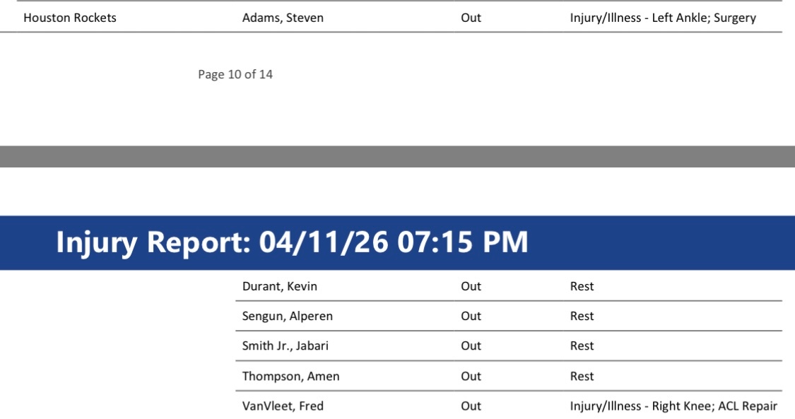已经确定西部第五的火箭明天最后一场比赛对阵灰熊,杜兰特、申京、贾巴里史密斯、阿门汤普森全都休息。