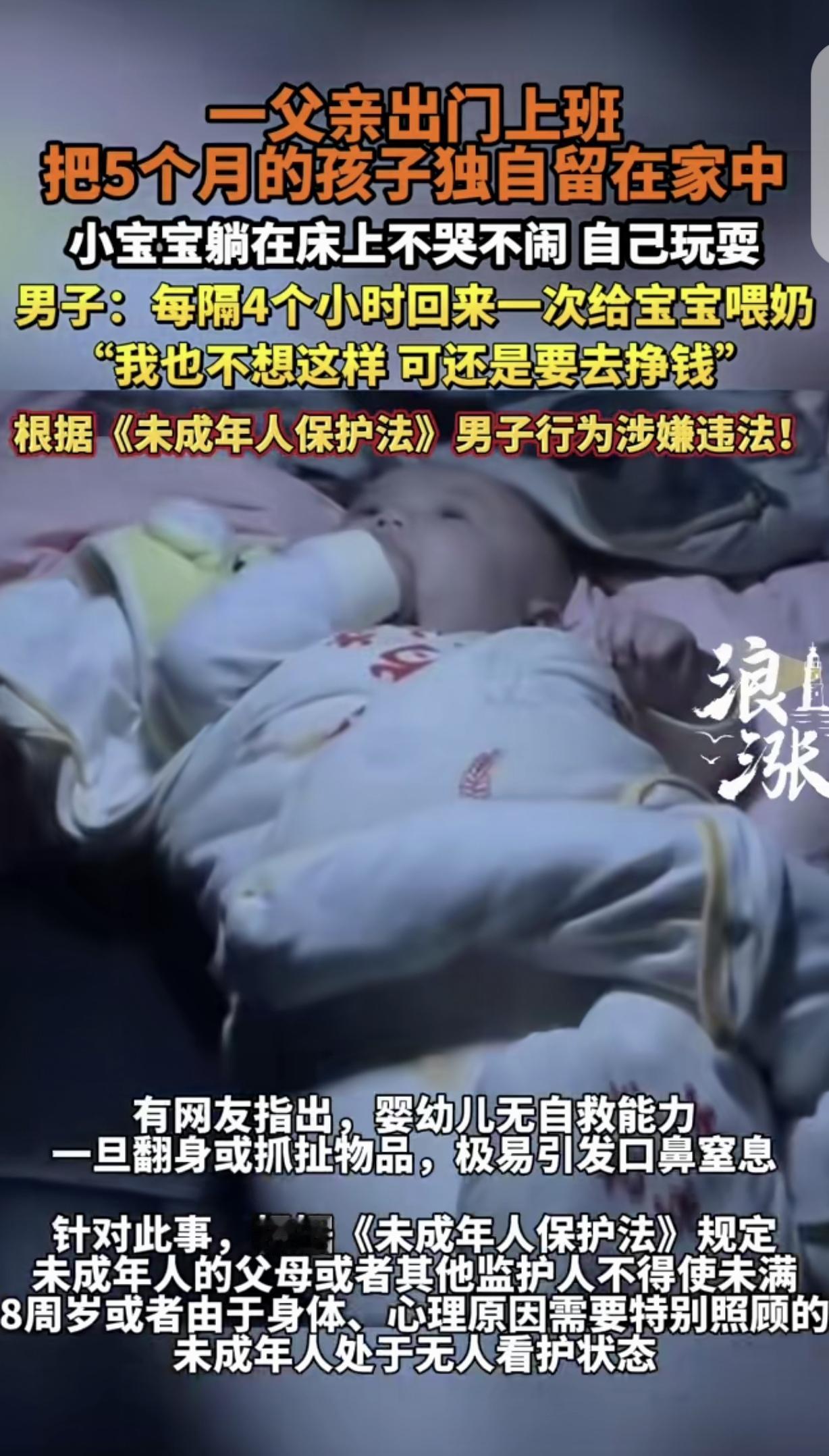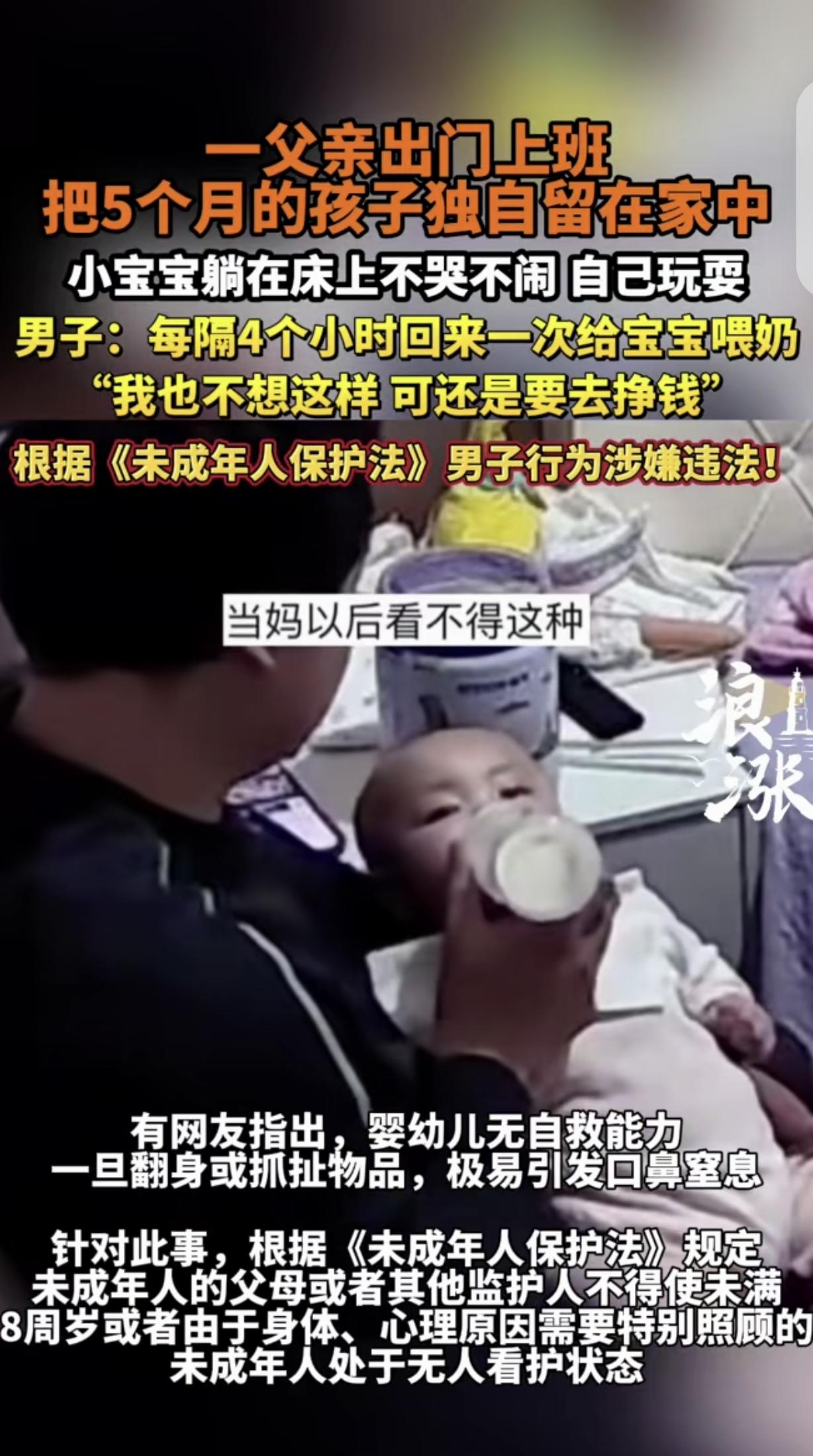 “贫穷不生也是一种善良!”浙江,一男子出门上班,把5个月大的女儿独自扔700元出租屋床上,小宝宝不哭不闹自己玩,男子每隔4小时,回家喂一次奶,他为了挣奶粉钱,有时候靠试药为生。网友都替孩子捏了把汗,担心她出事,谴责男子不配为人父,违反了未成年人保护法。男子委屈:孩子妈嫌我穷跑了,我只是个平凡的爸爸,想安心带女儿,但生活是残酷的,不工作孩子奶粉钱谁挣?我父母双亡,也没人帮着带孩子。 一男子父母双亡,他无依无靠,打工时认识一女子,两人生了个女儿。 可孩子还在襁褓中,女子就嫌男子穷,扛不住生活的压力,抛夫弃女一走了之。 从那以后,男子就成了既当爹又当妈的“单亲爸爸”。 为了养孩子,他得上班,但没人帮着带娃,又雇不起保姆,实在没办法,只能每天出门前,把5个月大的女儿独自留在出租屋里。 那出租屋小得可怜,一个月租金才700块,摆了一张床、一个破衣柜就没剩啥空间。 每天早上7点多,他给孩子喂完奶,换好干净的尿不湿,把她放在床中间,再在她身边围上几个枕头,怕她滚下来摔着,然后锁上门就往工厂跑。 中午11点多,他掐着点赶回家,冲奶粉、喂奶、换尿不湿,抱着孩子哄几分钟,就得又急匆匆往厂里赶,晚了要扣工资。 下午3点多再跑一趟,晚上下班回来,才能安安稳稳陪孩子玩会儿,给她洗个澡,夜里还要起来两三次喂奶。 就这点工资,有时候连奶粉钱都不够,他只能兼职去试药。 试药的钱来得快,但遭罪,吃完药后头晕、恶心是常有的事,有一次甚至上吐下泻躺了一天,可一想到孩子的奶粉罐见了底,他咬咬牙还是去了。 这事被发布在网上,一下子炸了锅。 好多人骂他不配当爹,说他把孩子独自扔在家里是犯法,万一孩子呛着噎着、从床上掉下来,出点事怎么办? 还有人说他自私,只想着自己挣钱,不管孩子的死活。 这些话像针一样扎得他难受,男子回应:我也想天天守着孩子,可我不上班,孩子喝西北风?我要是有办法,能把她一个人扔在家里? 其实他也怕,每次上班手里的活干到一半,就忍不住掏出手机看家里的监控,看见孩子安安静静地玩着床边的玩具,悬着的心才能放下。 谁都想给孩子安稳的日子,可生活有时候就是这么难,不是所有人都有选择的余地。 这个年轻爸爸的难处,或许没经历过的人真的懂不了。 看这事儿,真没法儿站着说话不腰疼,谁不想把娃揣在怀里疼? 可这小伙子爹妈没了,孩子妈也跑了,兜里掏不出请人的钱,不上班娃就得饿肚子,这不就是被逼到墙角了吗? 那些骂他的人,怕是没尝过一分钱掰两半花的滋味。 他把娃围上枕头、掐点回家喂奶、上班盯着监控,已经是在他能力范围内,给娃能凑出来的最大保障了。 生活哪有那么多“最优解”,更多的是没得选的“死扛”。 《未成年人保护法》第21条规定:未成年人的父母或者其他监护人不得使未满八周岁或者由于身体、心理原因需要特别照顾的未成年人处于无人看护状态。 但男子的行为实属生活所迫,并非主观恶意遗弃,而且已采取防护措施、定时回家照料,没造成实际危害后果。 在实践中,通常会结合具体情境酌情处理,更倾向于引导社 会帮扶而不是单纯追责。 对此,你怎么看?