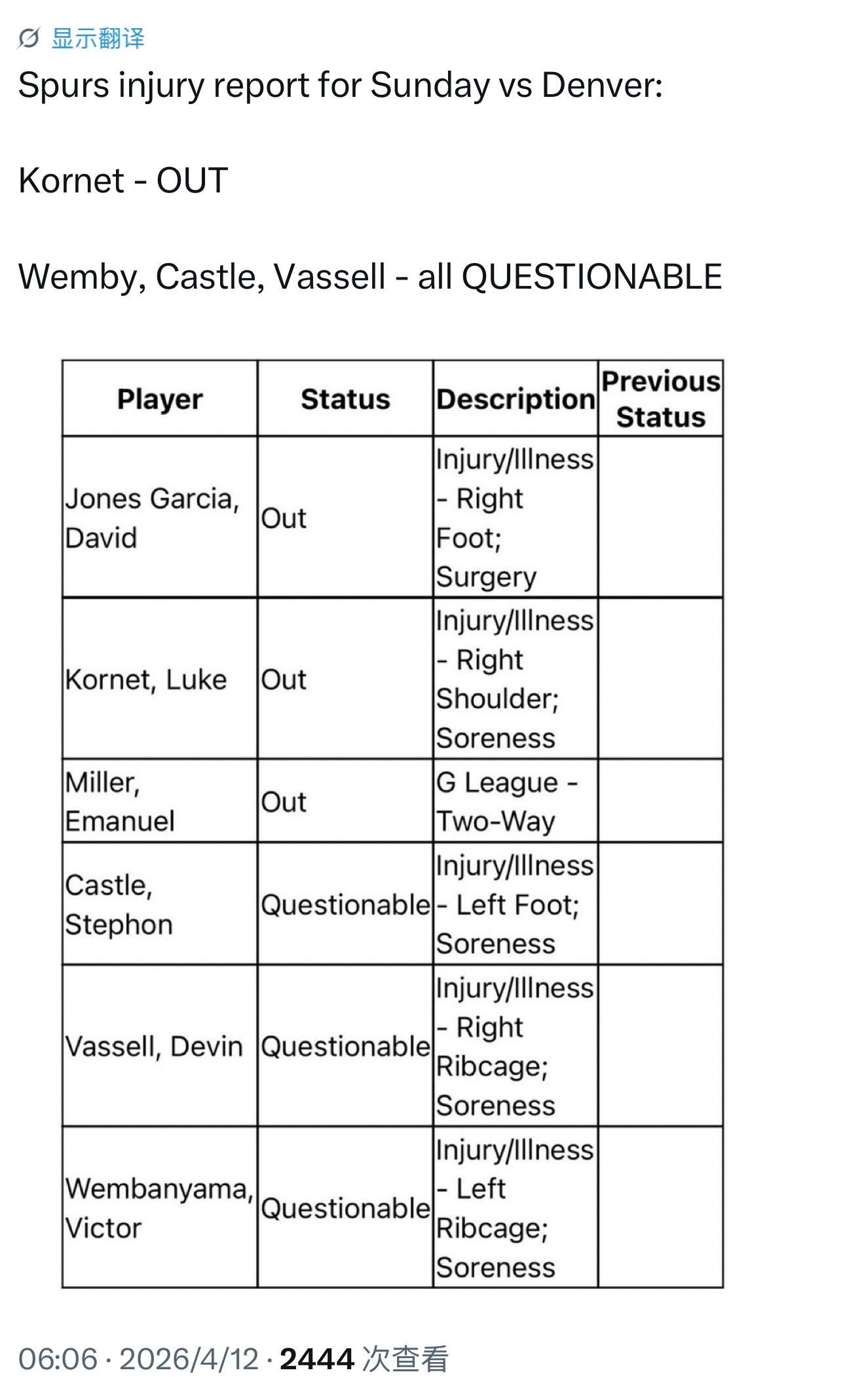 文班亚马/卡斯尔/瓦塞尔出战成疑,科内特不打。