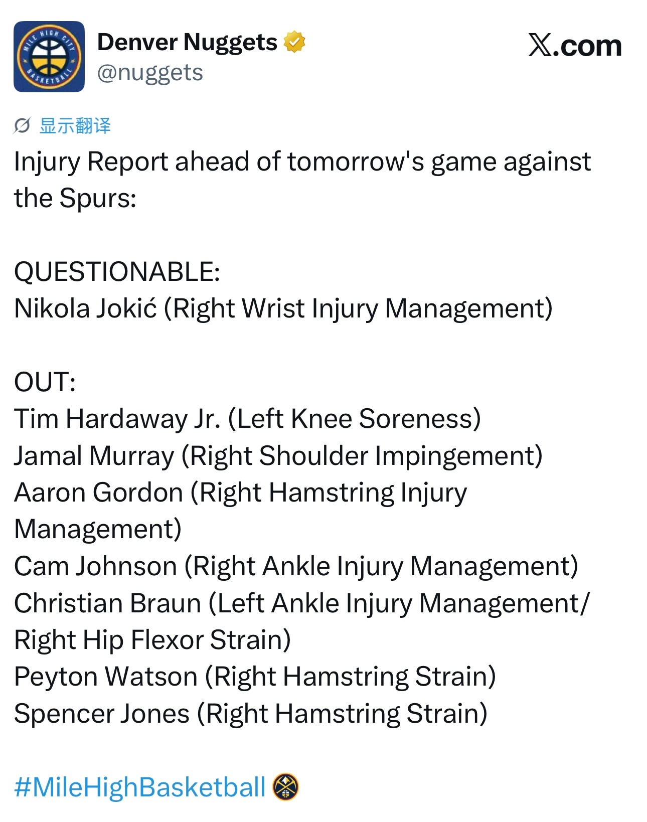 约基奇出战成疑,小哈达威/穆雷/戈登/卡约/布劳恩/沃特森/斯潘塞琼斯都不打。