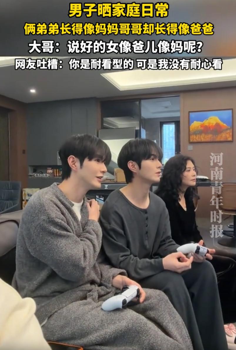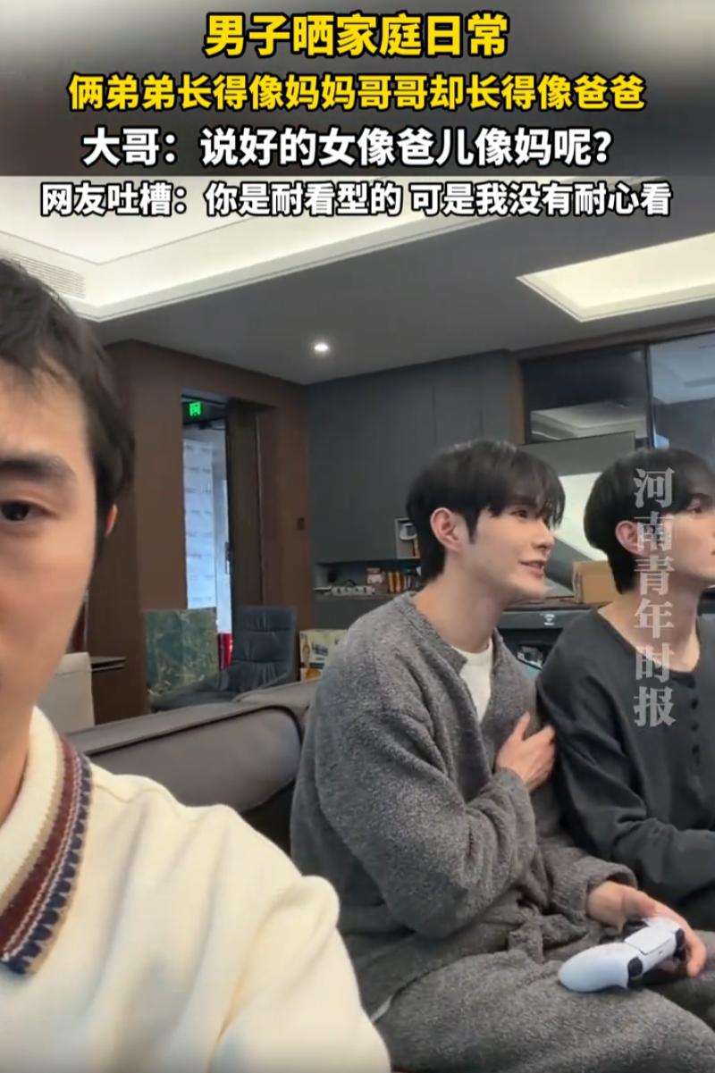 伤害性不高侮辱性极强!四川,一男子晒出自己一家五口的家庭日常,自己作为大哥,长得很像爸爸,可两个弟弟的长相却随了妈妈,他不理解为啥会这样,结果网友神评论:你是耐看型,但我没有耐心看 晚饭后坐在沙发上看电视、打游戏,大哥闲着没事拍视频,拍着拍着发现问题了。他看看左边,再看看右边,越看越不对劲 自己这张脸,简直就是老爸的翻版。同一个脸型,同一种五官布局,甚至连发际线的走向都一模一样,说他俩不是亲生的都没人信 可再看两个弟弟,画风完全不一样。兄弟俩五官柔和,眉眼之间全是妈妈的影子,跟妈妈像一个模子刻出来的 大哥当场就懵了。不是说好的女像爸、儿像妈吗?怎么到自己这儿,这套规律完全失灵了?别人家的大哥好歹是中间值,他倒好,直接把老爸的基因打包继承了,一点折扣都没打 其实仔细想想,这事挺有意思的 很多人从小就被家里亲戚说,你长得像爸爸或者像妈妈,好像一个人的长相必须得有个出处。可基因这件事,本来就是随机的,像谁不像谁,全看运气 像这位大哥,把爸爸的基因全盘接收,两个弟弟则继承了妈妈的。一家五口,硬生生分成了两个阵营。出门说是亲兄弟,别人可能都不太信 但这又怎样呢? 长相是爹妈给的,幽默感是自己的。大哥能把这事拍出来发到网上,说明他心态挺好。网友的评论虽然扎心,但大家乐一乐也就过去了 说到底,长得像谁不重要,重要的是这一家人整整齐齐坐在一起看电视的画面,才是真正让人觉得踏实的东西。 俩弟弟长得像妈妈 哥哥却长得像爸爸
