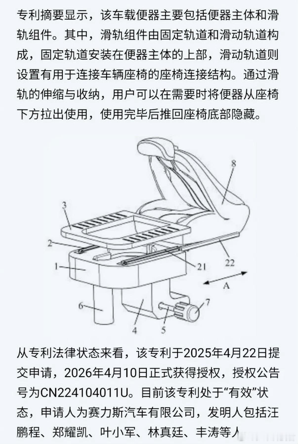 赛力斯将推出车载厕所留给车企的新功能真不多了,赛力斯申请的“车载便器及车辆”实用新型专利于4月10日正式生效。