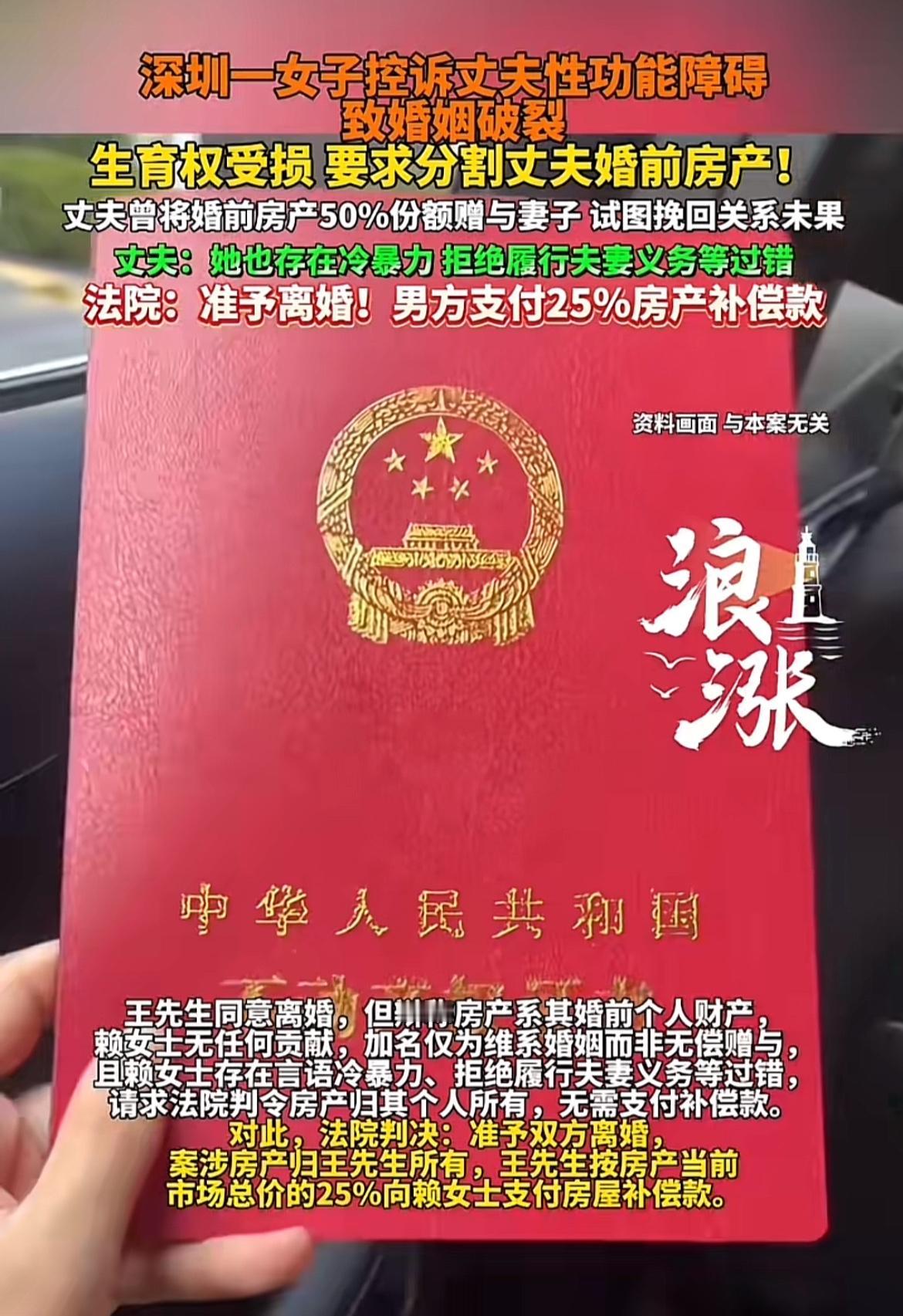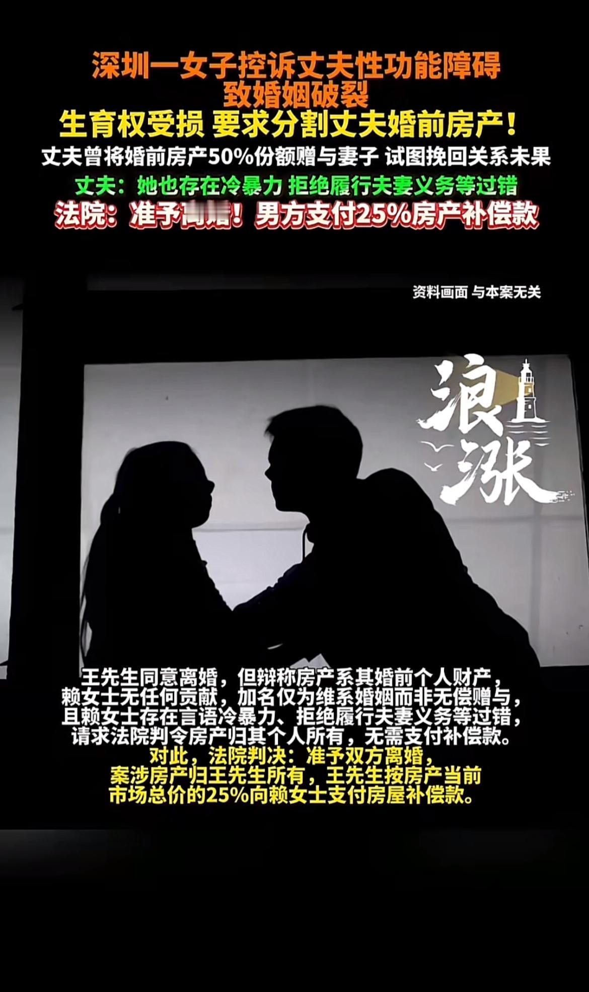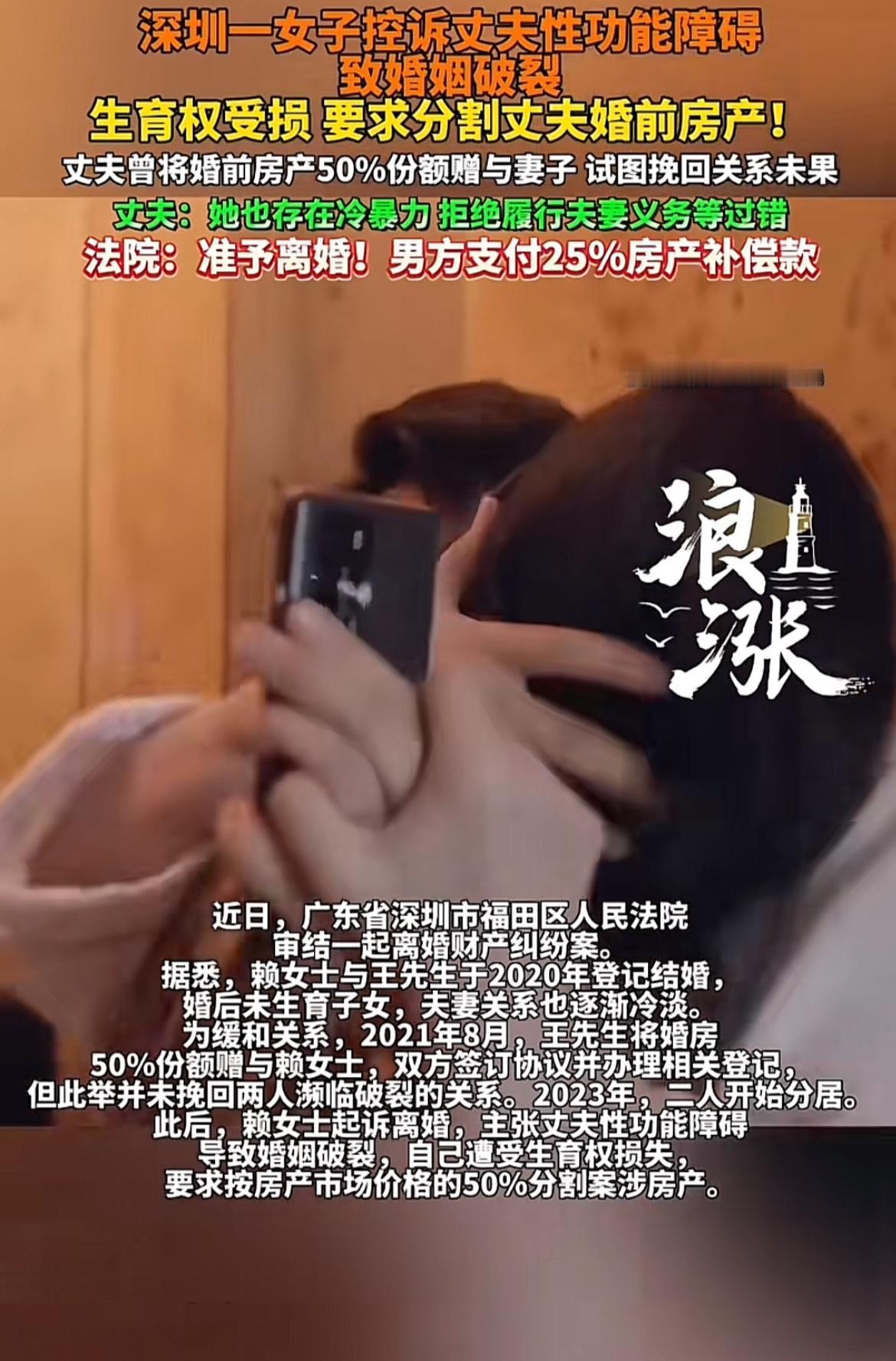 深圳这起离婚财产纠纷案太抓马了。赖女士和王先生2020年结婚,婚后关系冷淡。2021年王先生为缓和关系,把婚前父母赠与的婚房中50%份额给了赖女士。可这也没挽回婚姻,2023年两人分居。之后赖女士起诉离婚,称丈夫性功能障碍致婚姻破裂,自己生育权受损,要求分50%房产。王先生则说房产是自己婚前财产,赖女士没贡献,加名是为维系婚姻,还指责她有言语冷暴力等过错。最后法院虽准予离婚,但这种情况,房产到底咋分还真不好说,毕竟得综合各种因素考量。