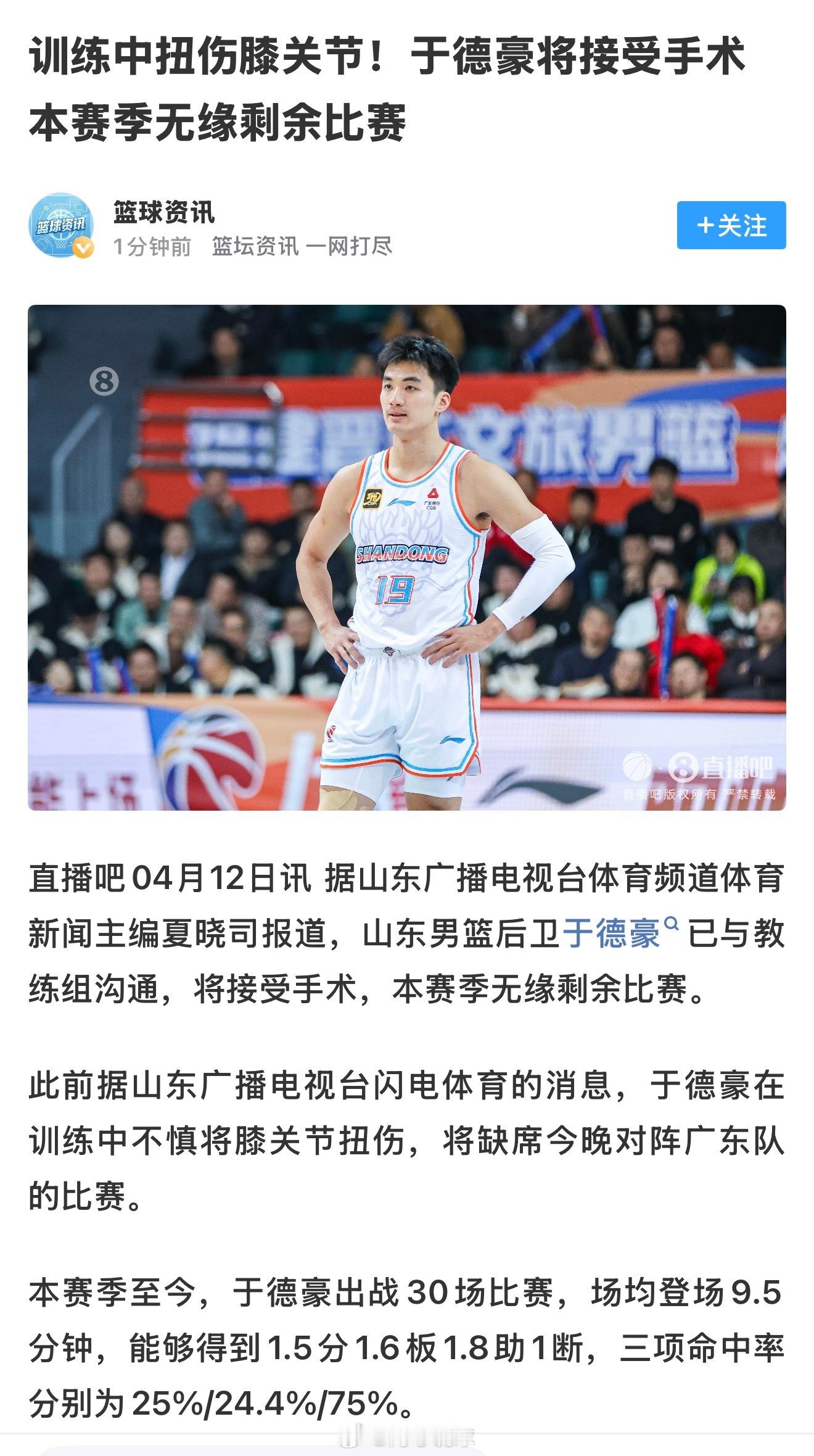山东男篮后卫于德豪训练中膝关节扭伤,已与教练组沟通,将接受手术,本赛季无缘剩余比赛。