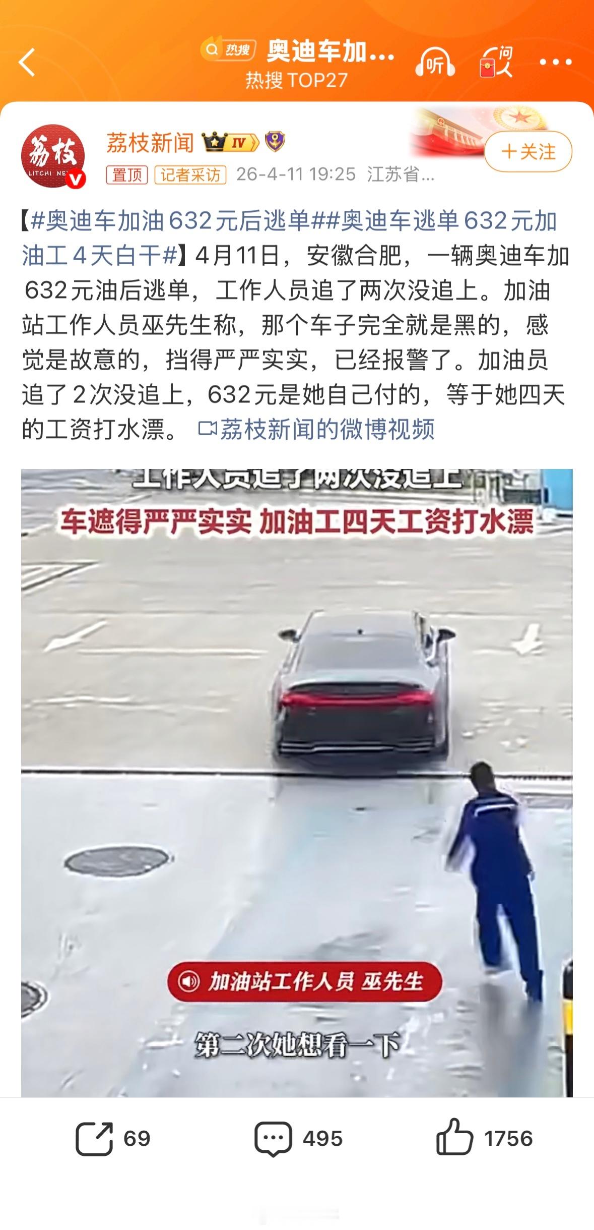 奥迪车加油632元后逃单奥迪都开得起,600多块钱的油加不起?