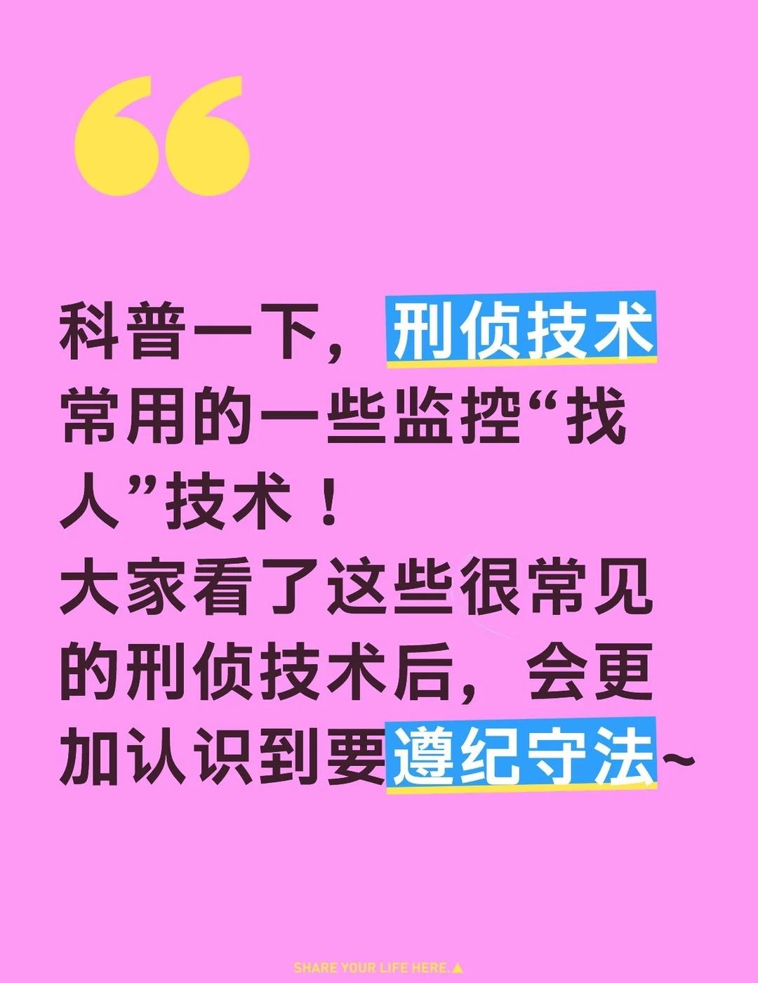 科普:刑侦中常用的监控找人技术! 1,最常见的就是天网人脸识别技术。我们在观看法制频道等经常可以听到一个词语“天网”,就是专门的监控系统。覆盖面很广,甚至戴了帽子、口罩也可以通过体态算法识别。 2,车辆卡口。这个不用多说,开过车的都懂~车辆开过了都会被抓拍~ 3,电子围栏。手机开机后会与附近基站连接,从而获取定位。我们用自己手机电话都可以获知自己的轨迹。 4,WIFI探针。wifi会自动扫描周边手机MaC地址记录,比如我们家里的WIFi被谁连过,连接的手机信息,进而到手机的身份信息,都可以被找到。 5,步态识别。人走路的姿势也是独一无二的,即便看不见人脸,看不清衣服特征,也可以识别。 6,社会上的各种监控。执法部门可以依法调取各种小区、商店等监控查看。 7,4g/5g信号定位。手机信号是可以定位的。 8,无人机应用。现在无人机应用非常广泛,几万块钱的无人机还有热成像探测,会让你藏无可藏。 9,时空轨迹碰撞。把各种抓拍的信息综合分析,找出真实的轨迹。 10,人工智能。现在人工智能的大量运用,可以自动追踪、分析找人找物等等~ …… 可以关注我,其实还有许多先进前沿的技术,大家有兴趣的可以交流,可以自行查询,都是公开的信息~也再次提醒大家,不要让这些技术去“找你”~ 法律 法律咨询 律师咨询 律师 法律服务 普法宣传 刑事律师 行政诉讼