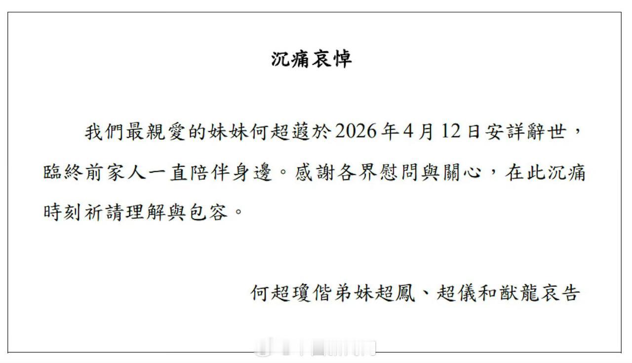 拥有万贯家财,难敌世事无常。已故“赌王”何鸿燊二房三女、信德集团执行董事何超蕸在香港逝世,享年59岁。在健康和生命面前,财富有时候看上去无关紧要。 ●何超蕸是已故赌王何鸿燊与二太蓝琼缨的第三个女儿,在二房子女中排行第三(介于何超凤与何超仪之间)。一生未婚且无子女,是家族中最低调的成员之一。与高调的姐姐何超琼(商业领袖)、妹妹何超仪(娱乐圈)形成鲜明对比。公众对其认知多为“隐形人”“低调实干派”,专注于事业与公益,鲜少参与家族纷争或娱乐话题。 ●何超蕸以59岁低龄遗憾离世,引发网友对生命无常的感慨,网友评论“纵有万贯家财,难敌世事无常”。愿逝者安息,生者珍重。