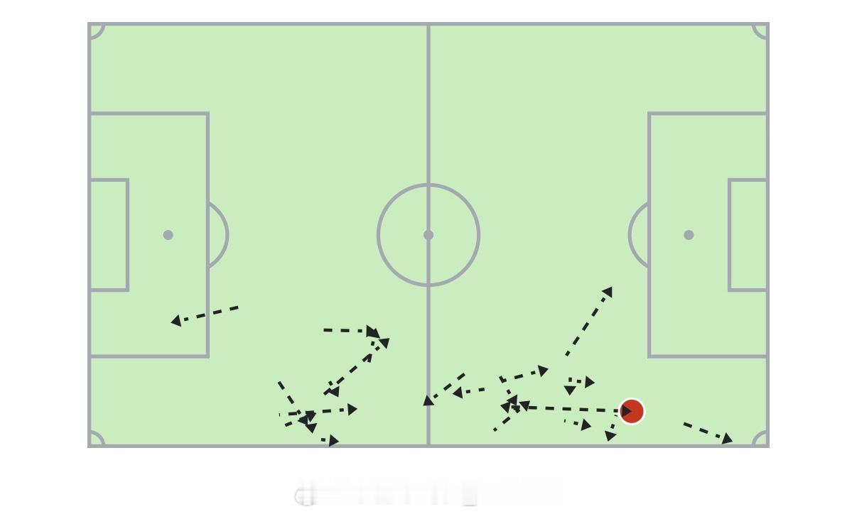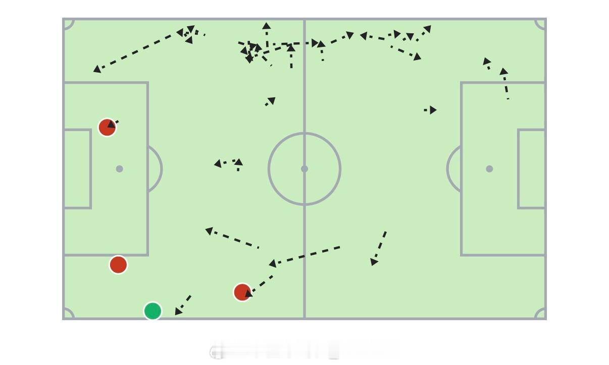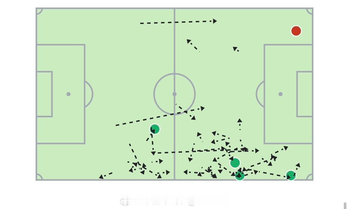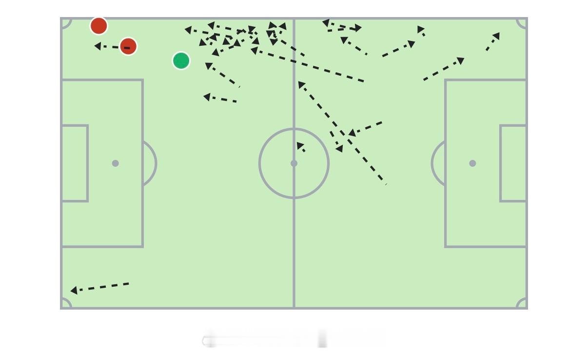 一方面,可以对比一下这五轮马纳法的带球起点,就可以很明显地发现区别:两个主场比赛里,马纳法带球的位置有一大半都在中前场,尤其是在30米区域周围。这就是去年开始一直讲的一点,你从自家大禁区前开始带球内切,是根本没有多少收益的事情。但如果你是从30米区域外开始带球内切,那就是完全不同的情况了。足球不是篮球,没有“控球后卫持球攻”这套东西,没有人应该在后场频繁地带球过人。