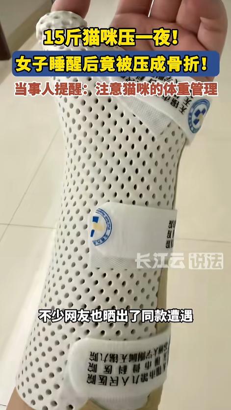 “万万没想到!”近日,江苏无锡,一女子养了只15斤重的猫,晚上被它枕着睡了一觉。第二天早上一醒,就发现自己手臂又酸又麻的,她也没再在意。可没想到却变得越来越疼,到医院一检查,竟然骨折了!网友:终究是猫猫扛下了所有! 养宠是很多人都喜欢的事,不少家庭,给宠物做好卫生之后,同吃同住也是常有的。一般注意点,只要不被抓伤咬伤,就没什么事儿,可谁能想到,还能被压出伤呢。 据媒体4月11日报道,陈女士自己养了只猫,平时经常抱,睡觉也允许它上床。因为吃的不错,这只猫猫已经长到15斤了,毛发也很鲜亮。 前几天晚上,睡觉的时候猫猫又爬上了床,枕着她的手臂睡着了。可没想到睡醒后,陈女士就觉得手臂不舒服,既酸又麻。她也只当是自己被压得时间太长,想着缓缓就好了。 三天以后,陈女士的手臂不仅没好,反而更疼了,这才去了医院。检查发现,她的手腕位置骨折了,被确诊为舟骨骨折。连医生对此都觉得不可思议。她也发了视频,提醒各位养宠人士,注意控制宠物的体重,免得步了她的后尘。 网友看后表示,舟骨骨折是最难好的骨折之一,这下可要遭罪了。不过,先别忙着让猫猫背锅了,还是先查查自己的问题吧。15斤的猫猫,枕着能有多沉,怎么可能轻易就骨折了呢?别是骨质疏松了! 信息来源:《15斤猫咪“压床”致女主人手腕骨折!》长江云说法