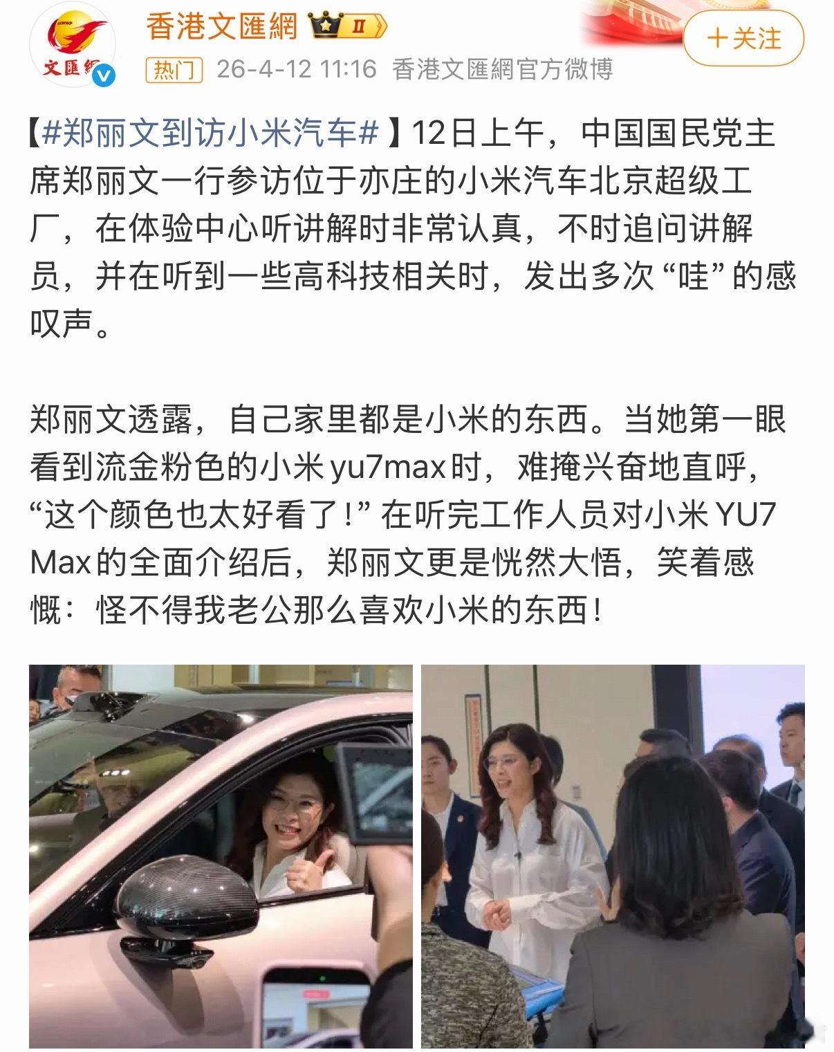 小米YU7 Max流金粉成功俘获郑丽文的心,坐在车里好开心😁
