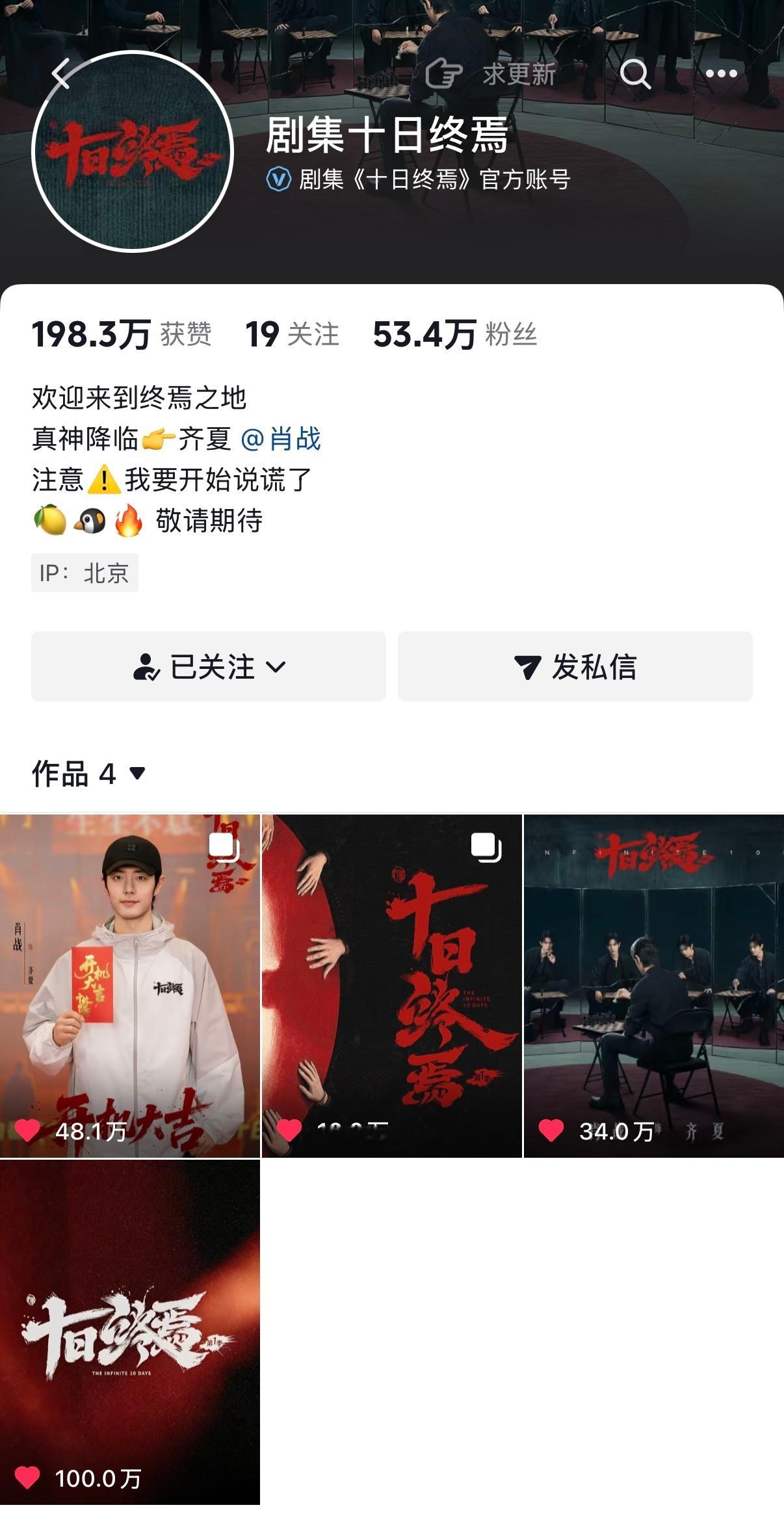 恭喜肖战《十日终焉》概念片抖音点赞量破100万!!!开机两天抖音就迎来了首个百万点赞,抖音官博粉丝数马上55万!!!概念片微博播放量破1亿,微博剧集指数蓄水期破1亿!!!肖战,扛剧的神!!!十日终焉肖战