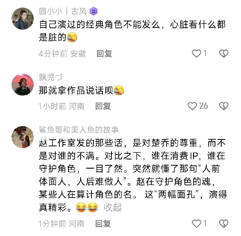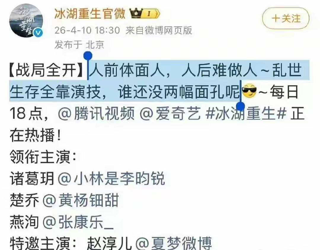 【冰湖重生】是在与赵丽颖工作室隔空对话吗 有人说赵丽颖工作室发她对楚乔的理解,是在内涵冰湖重生不懂楚乔。接着冰湖官博就回复“人前体面人……” 网友笑了,说他们这是在自抬身价。实际上根本没人把【冰湖重生】当做是【楚乔传】续集,高仿都算不上。 不少看过冰湖重生的人都说女主只会绷着脸和瞪大眼,压根没有楚乔那股韧劲,无法接受她是经历过种种波折后的女将军。 哪怕不看年龄,她也出戏。 网友评论: 那个女主干瞪眼演技真的太招笑了 就内涵冰湖重生了怎么样,谁让你们蹭楚乔第一部的热度,结果拍成这样[捂脸]把赵丽颖对楚乔的解读和信仰全都瓦解了 赵丽颖