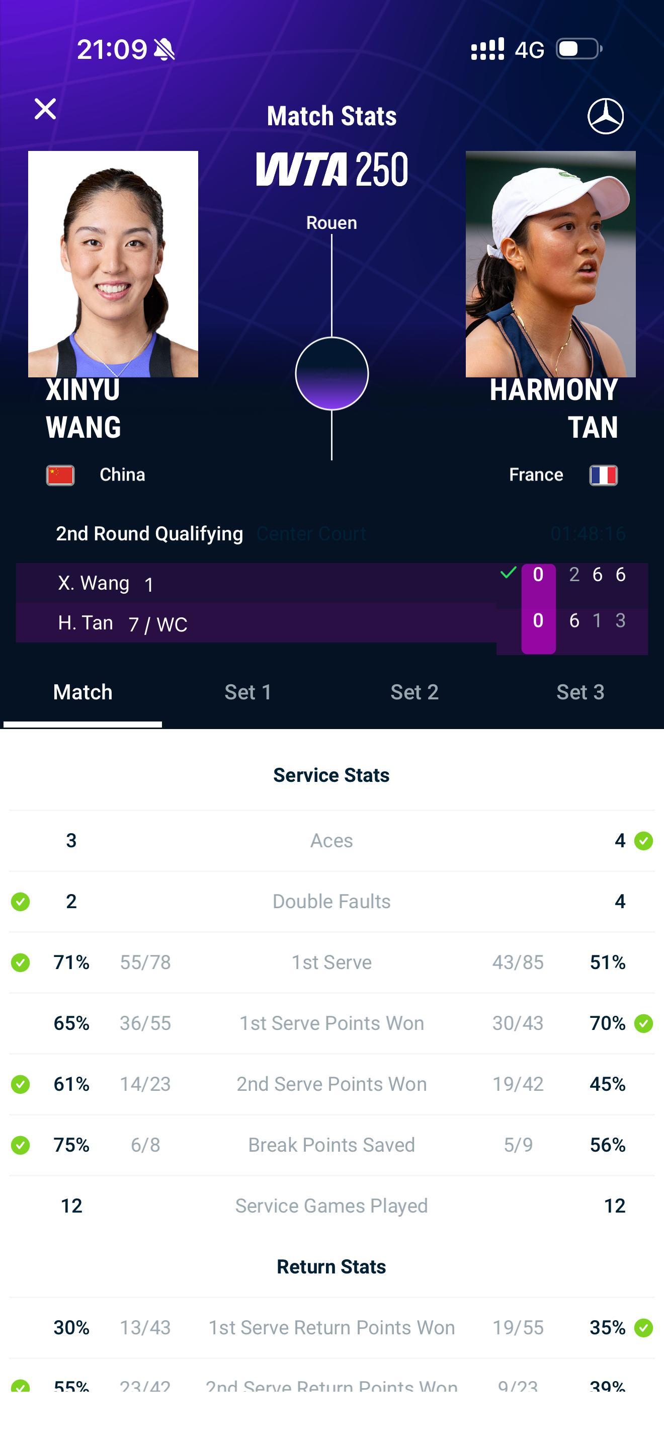 鲁昂250赛资格赛第二轮,王欣瑜再次为观众呈现三盘大战,2比6输掉第一盘后,6比1、6比3逆转持外卡出战的资格赛7号种子谭,挺进正赛。wta